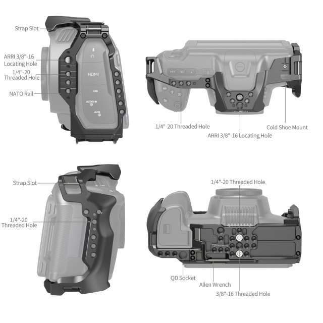 La jaula SmallRig para la Blackmagic Design Cinema Camera 6K 4785 está diseñada para la filmación a mano alzada con un movimiento fluido de la cámara. Protege la cámara y, al mismo tiempo, ofrece diversas opciones de ampliación. El sistema de fijación de tres puntos sujeta la cámara mediante dos tornillos de 1/4"-20 en la base y un tornillo de 1/4"-20 en la parte superior, mientras que las almohadillas de silicona integradas evitan los arañazos. La jaula ofrece libre acceso a todas las interfaces de la cámara, las ranuras para tarjetas, la pantalla abatible y el compartimento de la batería. El soporte del adaptador de objetivo es compatible con los adaptadores Sigma MC-31, Sigma MC-21 y adaptadores de objetivo similares, lo que evita daños en la montura de la cámara. La carcasa está equipada con orificios roscados de 1/4"-20, orificios roscados de 3/8"-16 y orificios de fijación ARRI para acoplar accesorios, como empuñaduras laterales(2093, 4016), empuñaduras superiores(2165C), soportes para monitor(2903, 2904), placas base Manfrotto(1280, 2458), trípodes(3989) y otros. Los orificios integrados con rosca de 1/4"-20 y 3/8"-16, los orificios de fijación ARRI y el soporte de pie frío permiten además fijar accesorios como brazos mágicos(3873), abrazaderas para cables(3271, 3289, 2960) y fundas protectoras para las interfaces, que evitan la pérdida de señal. Dos orificios con rosca de 1/4"-20 en el mango evitan que la cámara se tuerza cuando se orienta en posición vertical. El deslizador del lado izquierdo permite fijar rápidamente soportes giratorios (3847) y soportes deslizantes (4017), y facilita el montaje rápido de accesorios. Los soportes integrados para zócalo frío permiten montar micrófonos, luces LED de vídeo, soportes para SSD (ID 3272) y otros dispositivos. También está equipada con interfaces para correas compatibles con correas de muñeca(3848) y correas de hombro(2793). La interfaz QD permite una integración perfecta con las correas de hombro de enganche rápido QD(4118). La jaula se puede convertir en una funda de medio tamaño para ajustar el estabilizador, lo que garantiza un fácil alineamiento. Además, la jaula está equipada en la parte inferior con una llave Allen magnética que facilita el montaje y desmontaje de los accesorios.