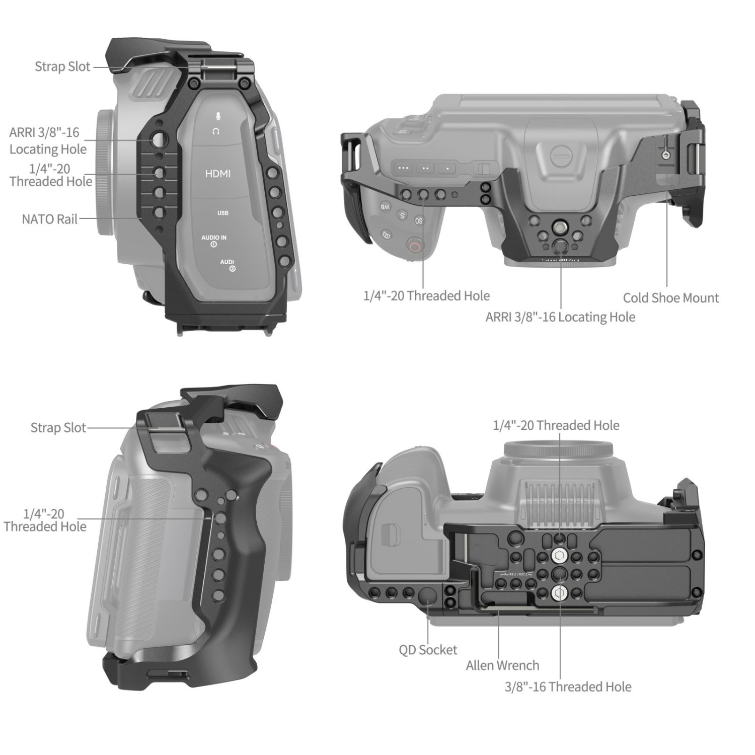 3. Interfaces integradas versátiles que incluyen orificios roscados de 1/4"-20, orificios roscados de 3/8"-16, orificios de posicionamiento ARRI, soportes para zapata fría, rieles NATO, soportes QD y orificios para correas de muñeca/hombro para diversos escenarios de rodaje.