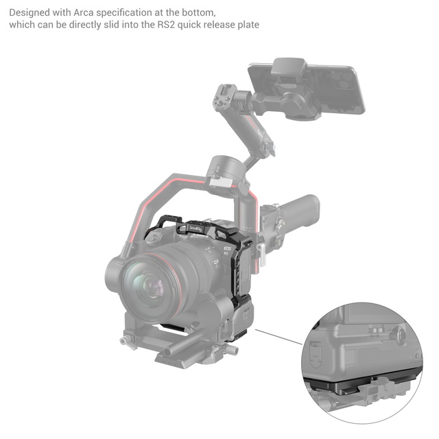 La jaula SmallRig para EOS R5/R6 con empuñadura de batería BG-R10 3464 protege la cámara y, al mismo tiempo, facilita la grabación de vídeo gracias a varios puntos de fijación para accesorios. La jaula se fija con un solo tornillo en la parte inferior y cuenta con orificios para la correa de hombro a ambos lados, lo que la hace estable e inamovible; además, está equipada con almohadillas de silicona internas que protegen la cámara de arañazos. Cuenta con orificios roscados de 1/4''-20 y 3/8''-16 para conectar accesorios, como la empuñadura lateral 2093, el asa superior 1984 y el brazo mágico 2070 con rótula, un orificio de posicionamiento superior ARRI 3/8"-16 para el asa superior 2165 y una zapata fría para micrófonos y luces LED. La parte delantera cuenta con un orificio para fijar la barra 3276 y conectar el sistema de enfoque motorizado. La jaula también tiene capacidad para la correa de mano PAC2456, la correa de muñeca PSW2398 y la correa de hombro PSC2428. Su llave integrada en la parte inferior ayuda a quitar los tornillos y la placa de fijación rápida Arca Swiss integrada es compatible con trípodes y soportes RS2.