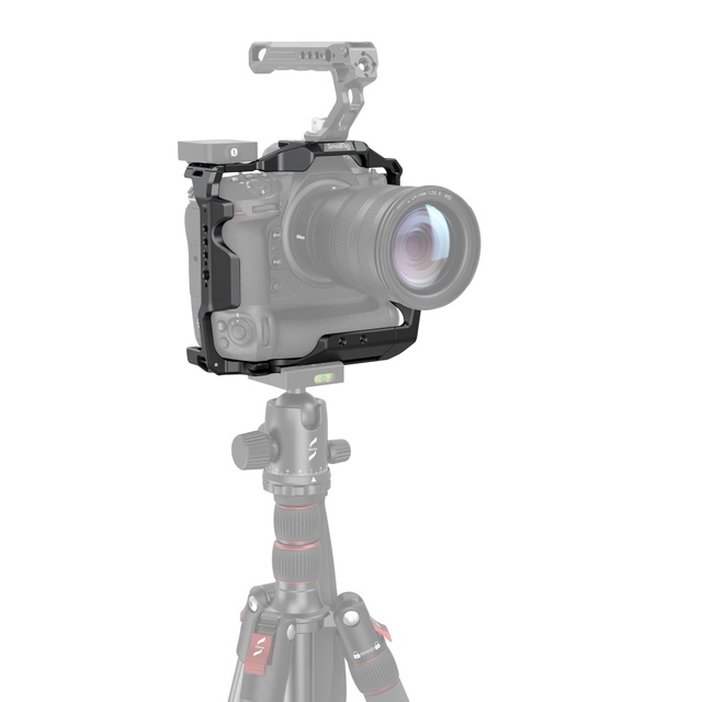 La jaula SmallRig para Nikon Z 9 3195 está diseñada para alojar accesorios y proteger la cámara. La jaula se fija a la cámara mediante un tornillo de 1/4'-20 y un pasador de posicionamiento en la parte inferior, y cuenta con un orificio para la correa de hombro en el lado derecho. Está equipada con varios orificios roscados de 1/4''-20 y orificios de posicionamiento ARRI de 3/8"-16, es compatible con la empuñadura superior 2165, la empuñadura lateral 2093, el soporte HSS2624 y el soporte para monitor 2903; Se suministra con una zapata fría en la parte superior para fijar micrófonos, luces LED, etc. En la parte inferior hay una placa Arca Swiss integrada que permite cambiar directamente a la grabación desde el trípode y está equipada con varios orificios con rosca de 1/4''-20, que permiten montar la placa de fijación rápida DJI RS 2/RSC 2 (superior) mediante dos tornillos de 1/4". La parte delantera de la jaula cuenta con dos orificios con rosca de 1/4''-20 para la abrazadera de barra de 15 mm 942, que sirve para sujetar el objetivo, el follow focus, el matte box, etc.