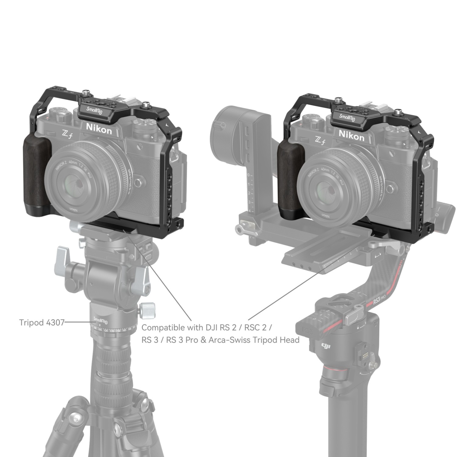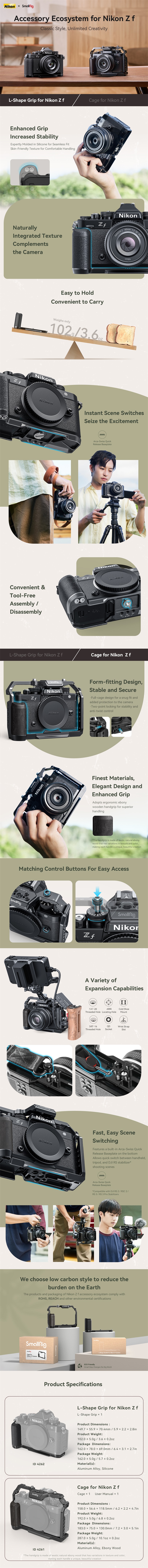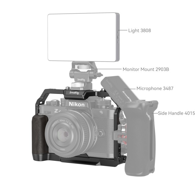 La jaula SmallRig para la cámara Nikon Z f 4261 está diseñada para proteger la cámara, fijar accesorios y mejorar el agarre. Sujeta la cámara Nikon Z f mediante un tornillo de 1/4"-20 en la parte inferior y un tornillo M2,5 en el lado derecho, mientras que las arandelas de goma evitan que se raye. La jaula está equipada con un asa de ébano, diseñada ergonómicamente para un agarre cómodo y una textura agradable, y mantiene un acceso completo a los botones, las ranuras para tarjetas, la pantalla abatible y el compartimento de la batería. En la parte superior, comparte elementos y la experiencia de uso con la cámara Nikon Z f. Para controlar el selector, basta con pulsarlo. Entre sus puntos de montaje se incluyen un orificio roscado de 1/4"-20, un orificio roscado de 3/8"-16, un orificio de posicionamiento ARRI de 3/8"-16 y un soporte para zócalo frío. Empuñadura lateral 2093C / 4016 / 3847, empuñadura superior 3765, soporte para monitor 2903 / 2904, placa de batería mini V-Mount 2987, abrazadera para una sola barra 3598, brazo mágico 3873, micrófono 3468, luz de vídeo LED 4055, etc. Además, hay orificios para correas: correa de mano 3848 / 3926, correa para el cuello 3485, fijaciones QD para correa de hombro 4118 y placa de fijación rápida inferior Arca Swiss para trípodes tipo Arca o gimbals DJI RS 2 / RSC 2 / RS 3 / RS 3 Pro para cambiar rápidamente entre los modos de cardán, mano alzada y trípode. El paquete también incluye una llave reversible para desmontar y montar fácilmente los accesorios.