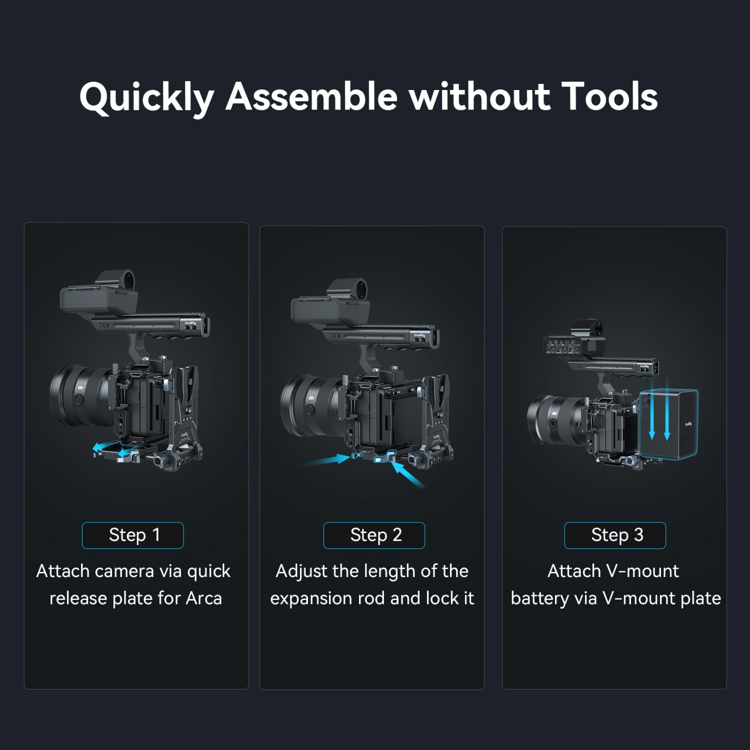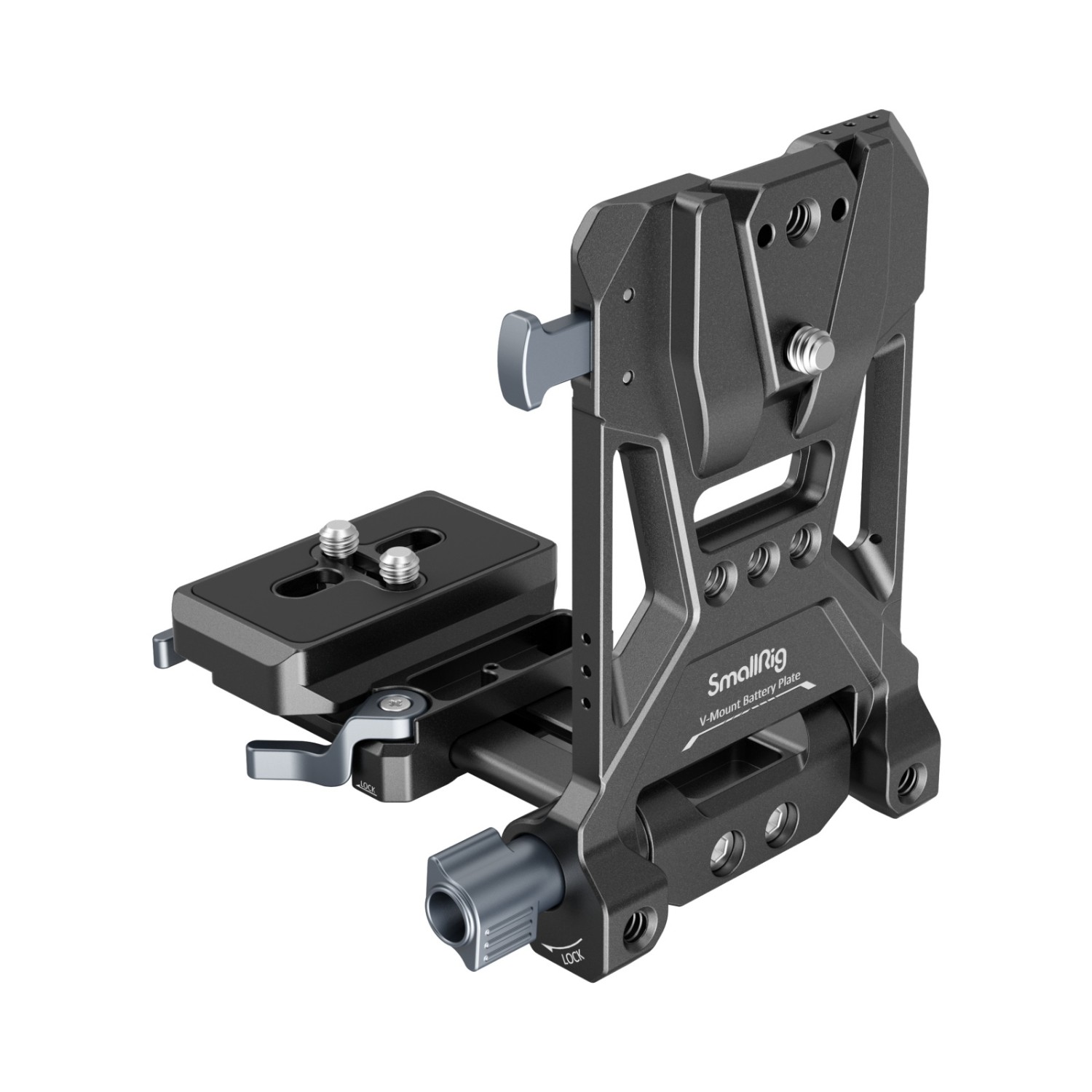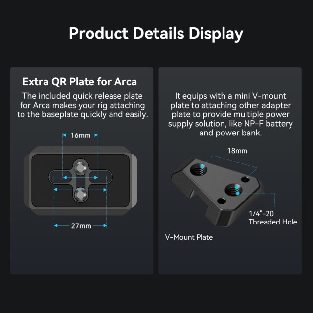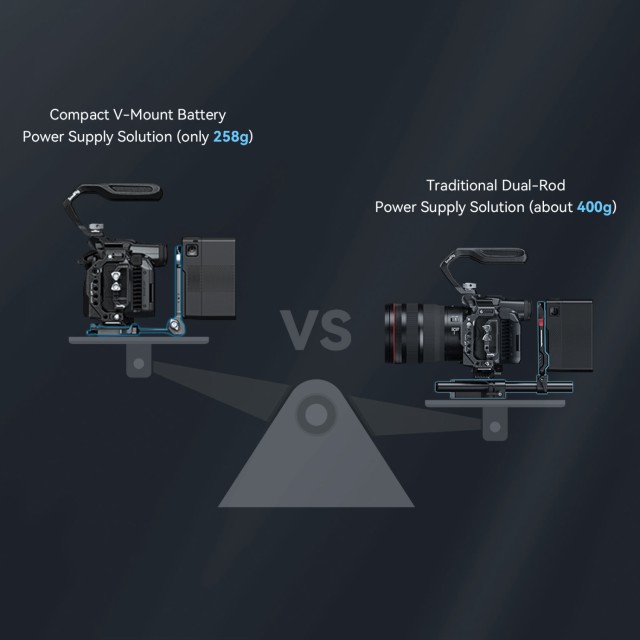 El sistema de montaje de bateríasV-mount compacto4064de SmallRig es una solución «todo en uno»compacta, ligera y cómoda para fijar baterías de tipo V-mount. El kit consta de una placa para baterías V-mount, una placa de fijación rápida tipo Arca y una placa V-mount. En particular, la placa base se puede extender para adaptarse a cámaras sin espejo y DSLR de distintos tamaños, lo que se facilita gracias a una instalación y ajuste sin herramientas, lo cual es rápido y ahorra tiempo. Además, cualquier jaula con placa Arca integrada puede soportar directamente cámaras y gimbals de la serie DJI RS mediante la placa de fijación rápida Arca Swiss. La placa para batería V-mount con orificios roscados de 1/4"-20 y placa V-mount ofrece más soluciones de alimentación mediante la conexión de la placa adaptadora de batería NP-F Professional Edition 3168 o el soporte para baterías externas portátiles BUB2336. El cambio entre el disparo manual y el disparo con trípode también es más fácil gracias a la placa inferior tipo Arca. La placa para batería V-mount, que gira 90 grados, deja suficiente espacio para la pantalla abatible, mientras que el amortiguador de giro evita que el dispositivo se caiga. Se puede plegar hacia abajo para mayor compacidad y portabilidad.