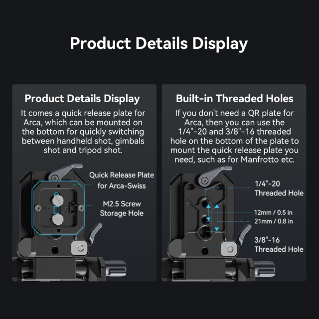 4. Placa de fijación rápida Arca-Swiss para cambiar rápidamente entre el disparo manual y el disparo con trípode