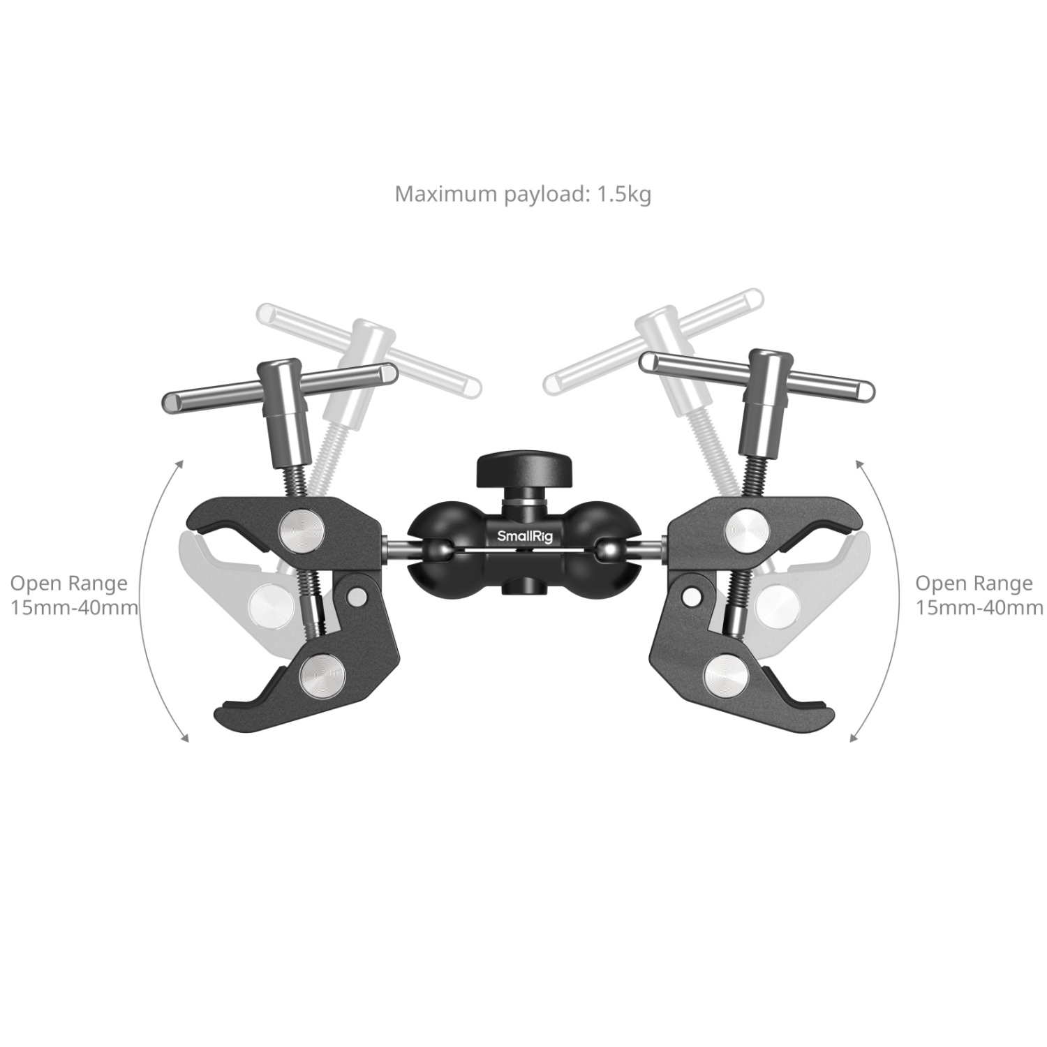 La pinza de doble cabezal SmallRig con forma de cangrejo 5331 consta de un brazo mágico universal y dos pinzas con forma de cangrejo para ofrecer soluciones de montaje versátiles. Cada pinza tiene un rango de sujeción de 15-40 mm (0,6-1,6 pulgadas) con almohadillas de goma antideslizantes, lo que permite fijar de forma segura diversos accesorios, como paraguas reflectantes, palos para selfies o micrófonos, a tubos, mesas, patas de trípode o barandillas.