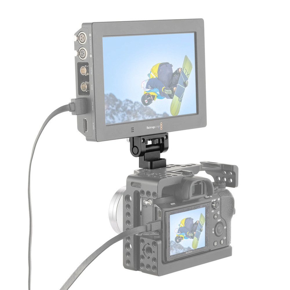 El soporte para monitor SmallRig Tilt Monitor Mount 1842 está diseñado para fijar un monitor a una jaula de cámara, una empuñadura u otro sistema de montaje mediante dos tornillos de 1/4"-20. El soporte de aluminio permite una inclinación de 180° sin necesidad de herramientas y se puede fijar libremente en cualquier posición. Soporta monitores de 5" o 7" con un peso de hasta 1,5 kg. Está equipado con una almohadilla de goma en la parte superior que evita que se raye el monitor. El tornillo de fijación cuenta con orificios para una llave hexagonal, lo que lo asegura firmemente y garantiza la seguridad de tu monitor. Puedes ajustar la tensión del soporte para monitor regulando los tornillos M4 de cada lado según tus necesidades.
