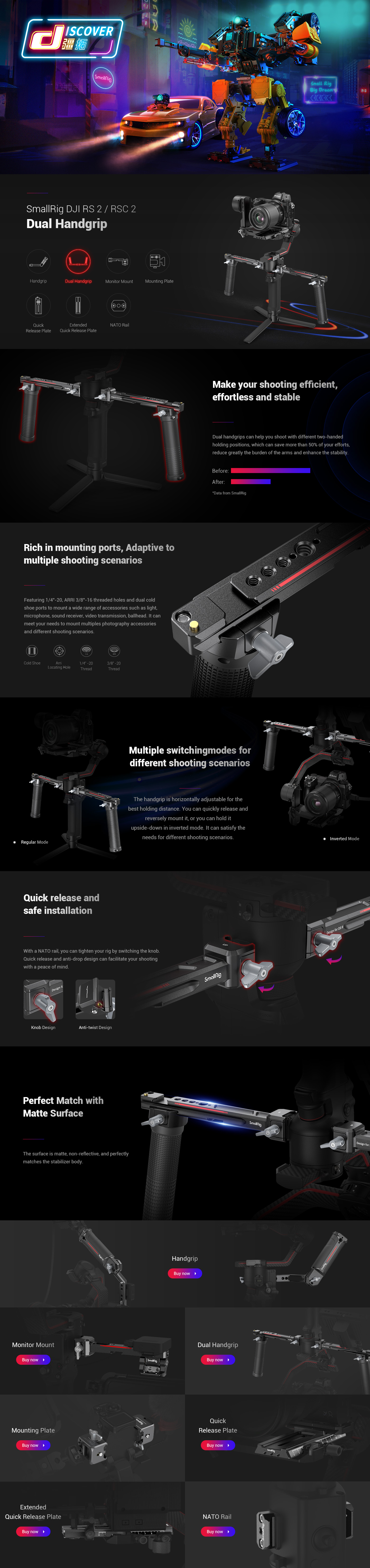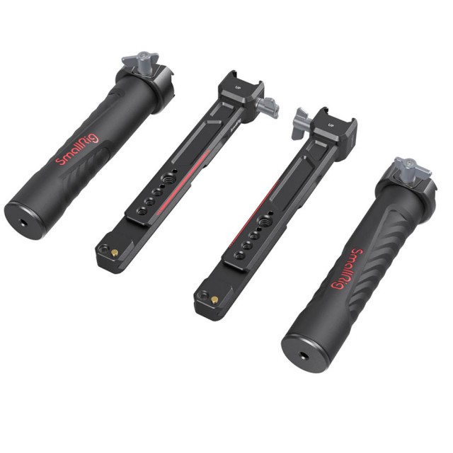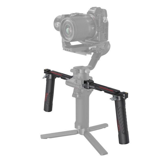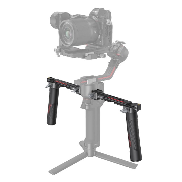 La empuñadura doble SmallRig para DJI RS 2 / RSC 2 / RS 3 / RS 3 Pro / RS 4 / RS 4 Pro 3027 está diseñada para reducir la fatiga de las manos durante la grabación y ofrecer numerosas opciones de fijación de accesorios. Se fija a las ranuras NATO de ambos lados del gimbal, se desmonta fácilmente y ahorra tiempo. La empuñadura está diseñada con rieles NATO a ambos lados, que no solo son ajustables horizontalmente, sino que también se desmontan fácilmente y permiten grabar en modo invertido. Gracias a los múltiples orificios integrados con roscas de 1/4"-20 y ARRI 3/8"-16, se puede acoplar el brazo Magic Arm 2115 para el monitor. Los orificios de la zapata fría se pueden utilizar para el soporte de monitor 2905, un GoWireless, un micrófono, un receptor de audio, etc. Se puede desmontar en cuatro partes para facilitar su almacenamiento y transporte.