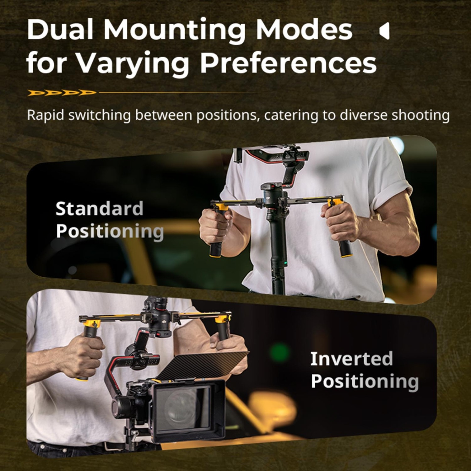 · Empuñadura giratoria: ajustable horizontalmente y giratoria para ángulos de sujeción perfectos, función « » para movimientos creativos de la cámara.