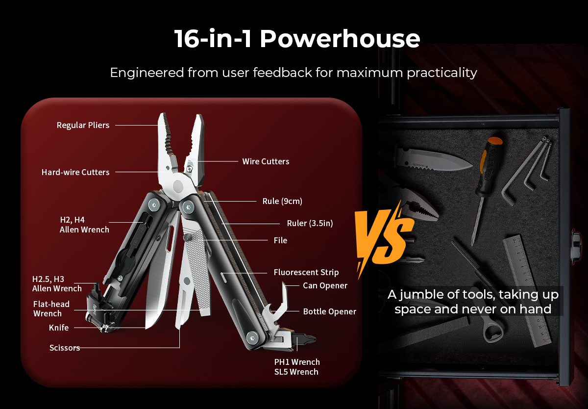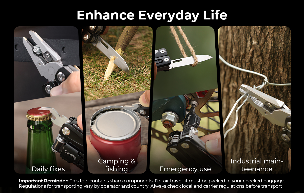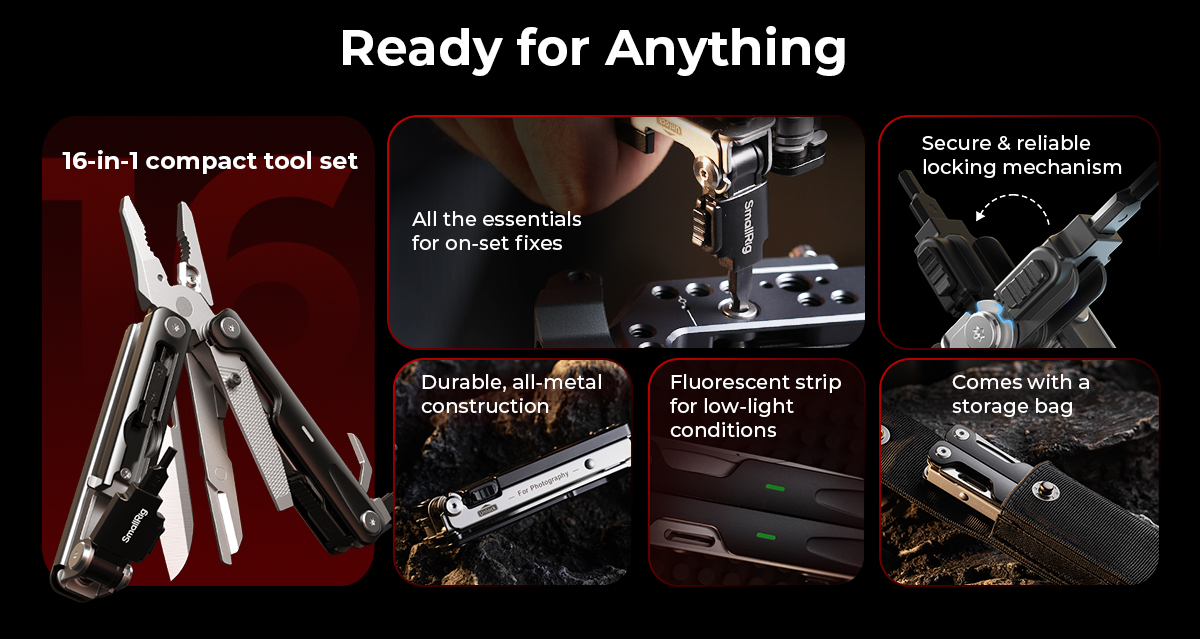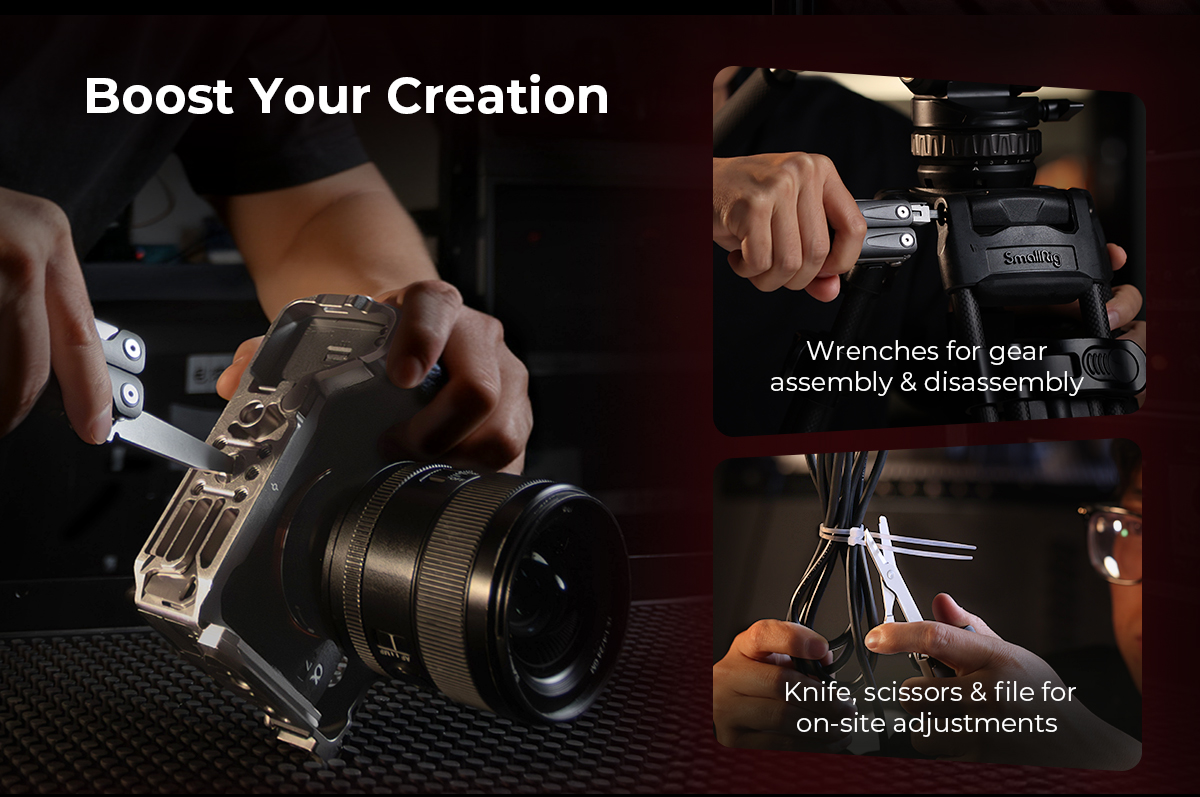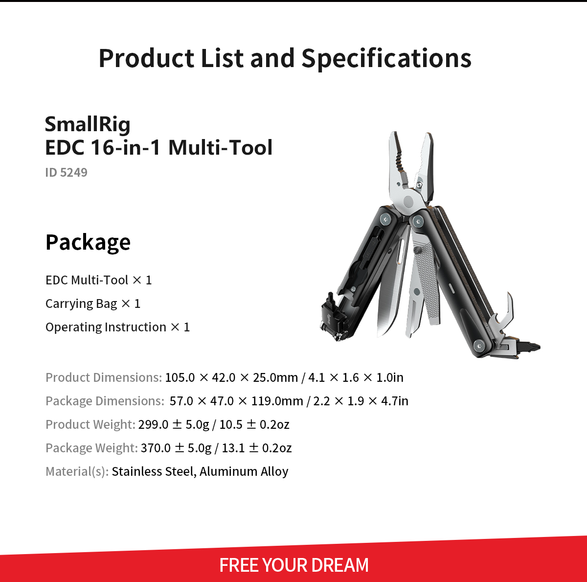 La SmallRig EDC Multi-Tool 5294 es una solución integral diseñada a medida para creadores y cineastas. Combina 16 herramientas imprescindibles en un solo dispositivo, entre las que se incluyen llaves Allen (H2, H2.5, H3, H4), una llave plana, un cuchillo, unas tijeras, una lima y unos alicates, indispensables para realizar ajustes en el equipo durante los desplazamientos. El kit también incluye herramientas comunes, como destornilladores planos SL5 y destornilladores de estrella PH1, abrebotellas y abrelatas, y una regla con doble escala (métrica e imperial). El diseño plegable integrado reúne todo el conjunto de herramientas en un kit de bolsillo, lo que maximiza la eficiencia sobre el terreno.