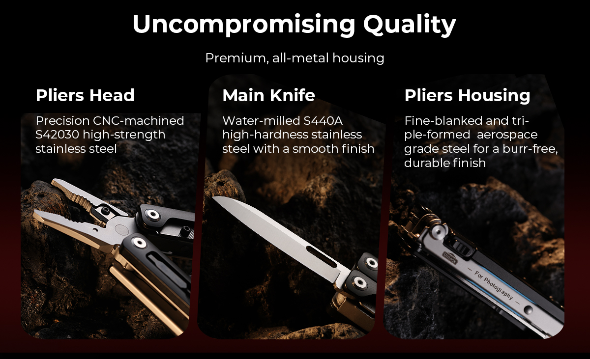 Cada herramienta está equipada con un tope de seguridad para un funcionamiento seguro y controlado, mientras que las herramientas accesibles desde el exterior (cuchillo, lima, llave) permiten un uso rápido con una sola mano.