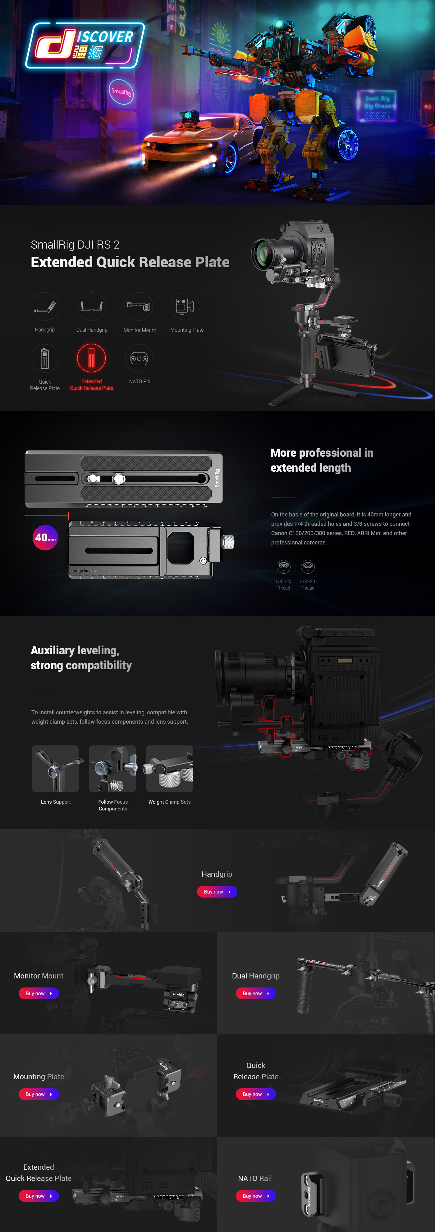 La placa de montaje rápido extendida SmallRig para DJI RS 2 / Ronin-S / RS 3 / RS 3 Pro 3031B está diseñada para montar cámaras profesionales, como la Canon C100/200/300, RED y Komodo, en el gimbal. La placa extendida añade 40 mm con respecto a la placa original para la cámara. En la parte trasera se puede añadir el juego de contrapesos 3125 para equilibrar el estabilizador, fijar el soporte para objetivo 2850 para proteger el soporte del objetivo y el componente del motor de enfoque 2851 para conectar el motor de enfoque DJI, si el objetivo está montado en un cuerpo de cámara grande o en una cámara con empuñadura de batería. Además, el orificio roscado de 1/4"-20 de la parte inferior se puede utilizar para añadir contrapesos AAW2284 o AAW2285 para equilibrar el sistema.