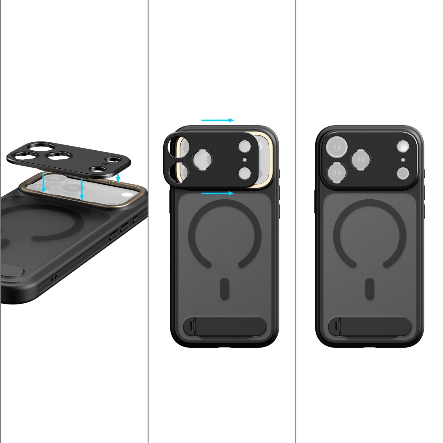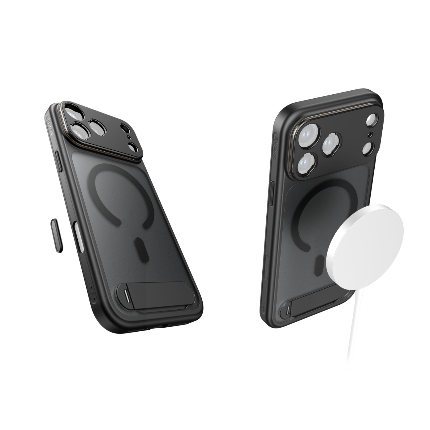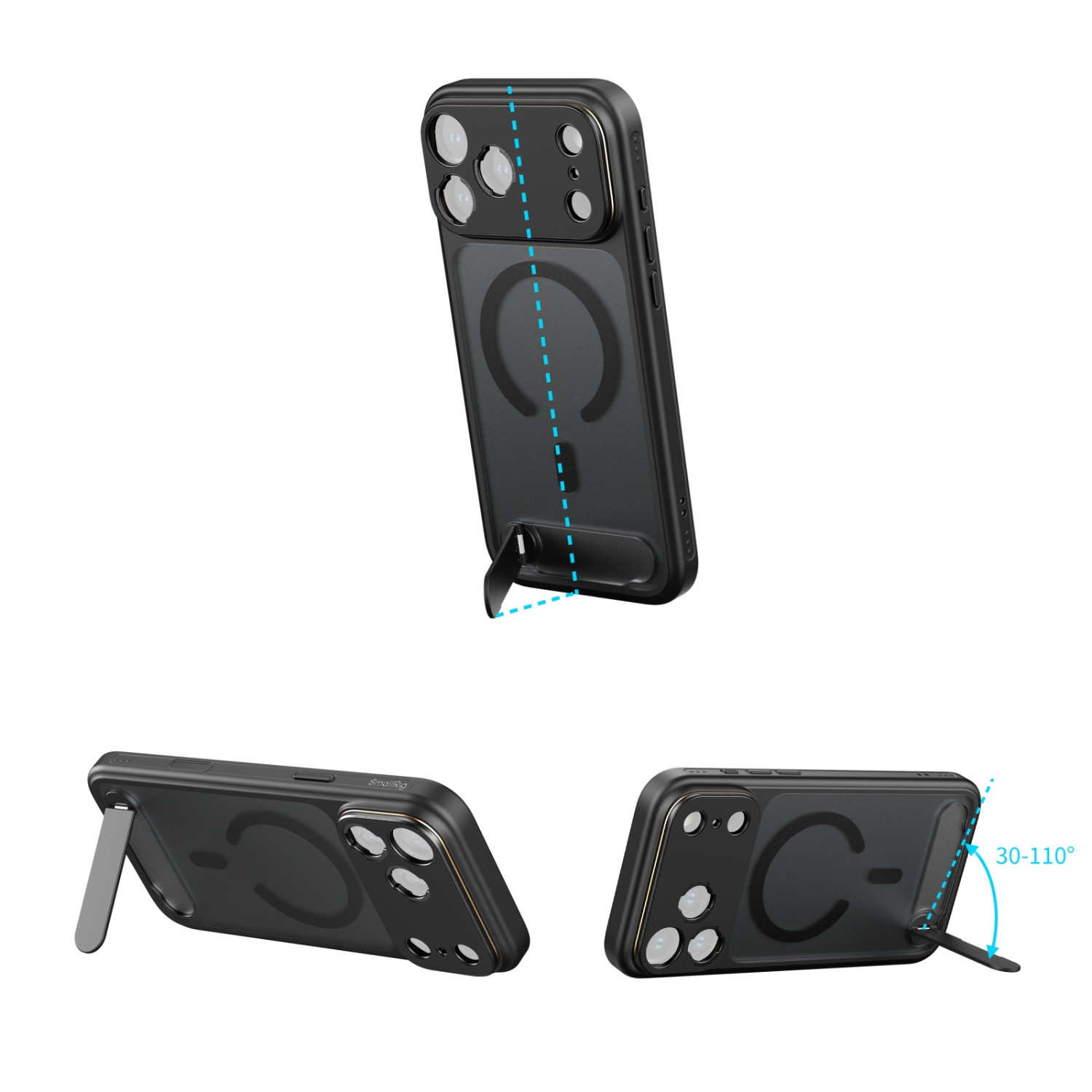 La funda está diseñada para una funcionalidad óptima y se adapta perfectamente al botón de control de la cámara del iPhone, lo que proporciona una respuesta táctil sensible y, al mismo tiempo, garantiza una protección integral. El soporte multiángulo integrado (30°-110°) permite cambiar fácilmente entre la orientación vertical y horizontal. Los imanes MagSafe integrados garantizan una compatibilidad universal con los accesorios MagSafe, mientras que la abertura lateral para la correa facilita la fijación de una correa de muñeca o una bandolera para un transporte cómodo durante los desplazamientos.