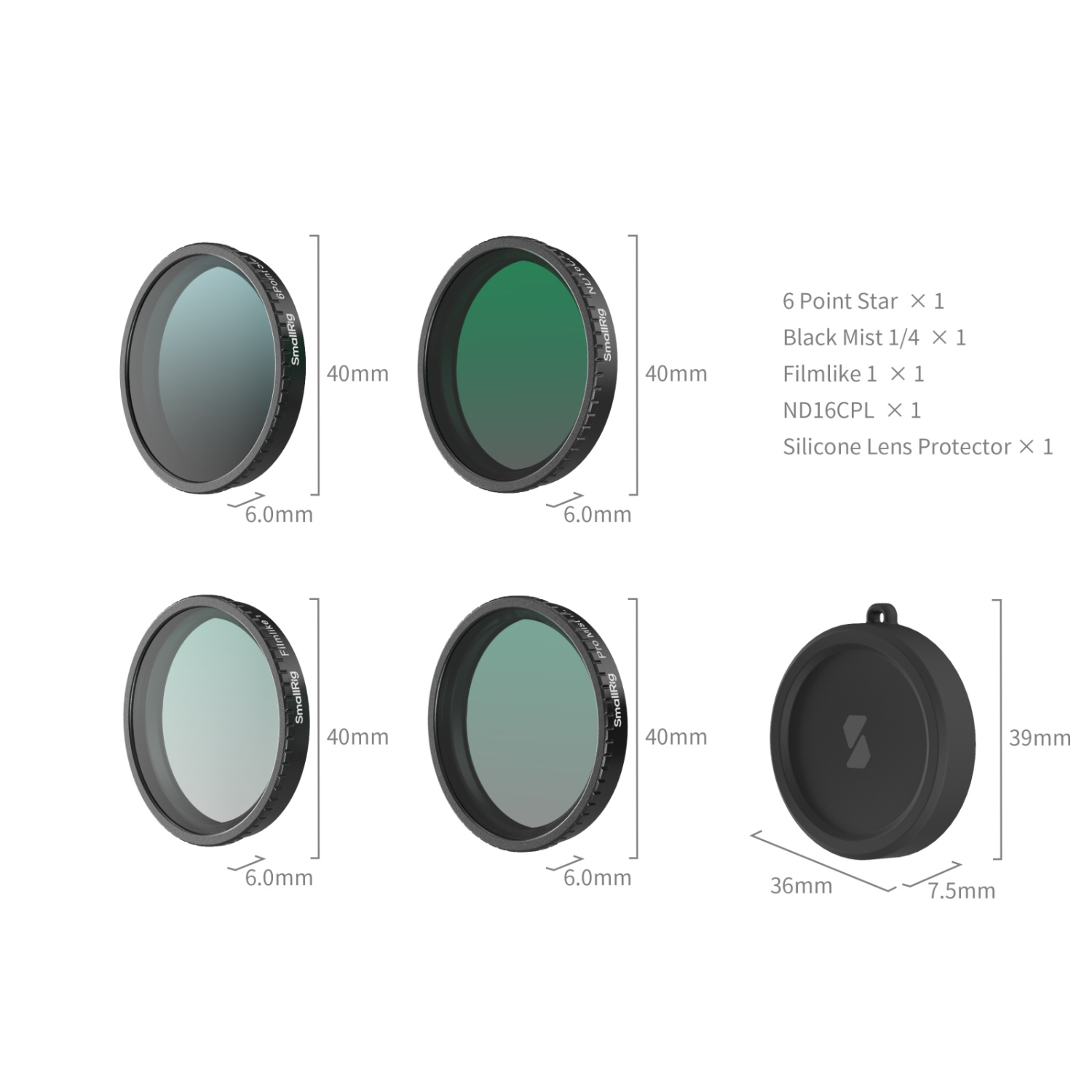 Este kit incluye un filtro de niebla negra 1/4, un filtro ND16 y CPL, un filtro de simulación de película, un filtro de estrella y una funda de silicona para el objetivo. El filtro de niebla negra 1/4 suaviza las luces y crea un efecto onírico y cinematográfico. El filtro ND16 y CPL elimina los reflejos y, al mismo tiempo, garantiza una reproducción fiel de los colores, por lo que es ideal para fotografiar paisajes y arquitectura en condiciones de mucha luz. El filtro de simulación de película crea tonos analógicos de película, ideales para retratos, fotografía callejera y fotos de estilo vintage. El filtro de estrella transforma las fuentes de luz puntuales en espectaculares rayos de 6 puntas en escenas nocturnas. Para mayor comodidad y protección, el kit incluye una funda de silicona suave para el objetivo, que protege el objetivo de la cámara contra arañazos y polvo cuando no se utiliza.