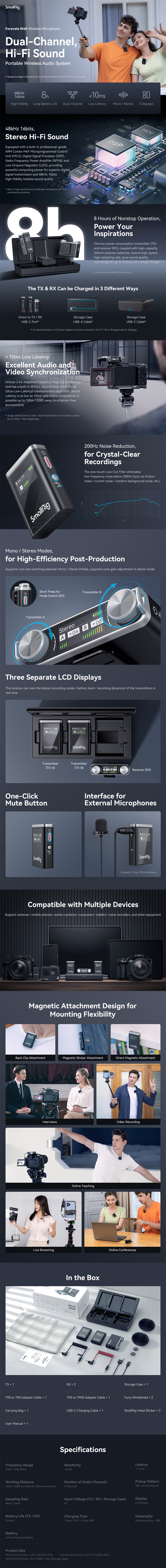 El SmallRig Forevala W60 es un micrófono inalámbrico de 2,4 GHz con baja latencia de audio, un accesorio imprescindible para los aficionados a la fotografía y la grabación de vídeo. Gracias a su DSP de última generación para el procesamiento de ruido y sonido, es compatible con dispositivos como teléfonos inteligentes, cámaras, estabilizadores, cámaras de acción, ordenadores, grabadoras, videocámaras, bolígrafos de grabación y tabletas, y ofrece una calidad de grabación profesional.