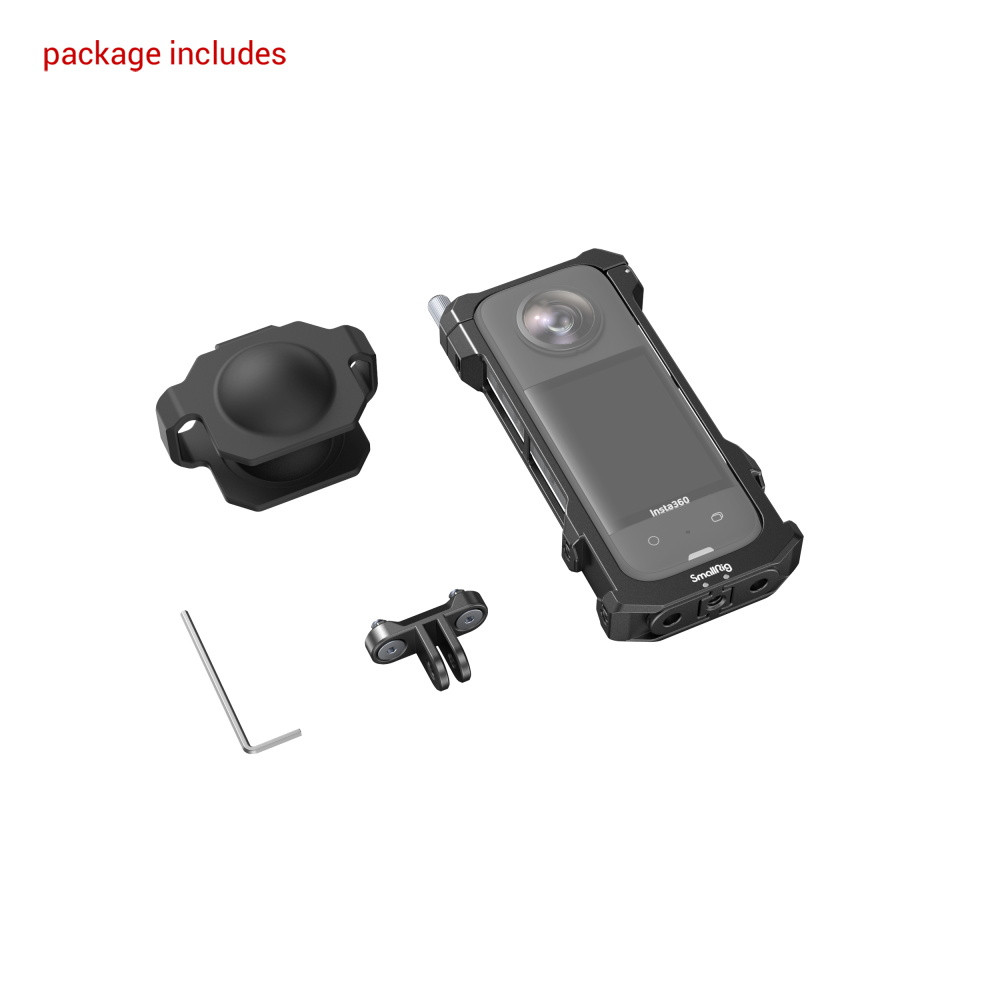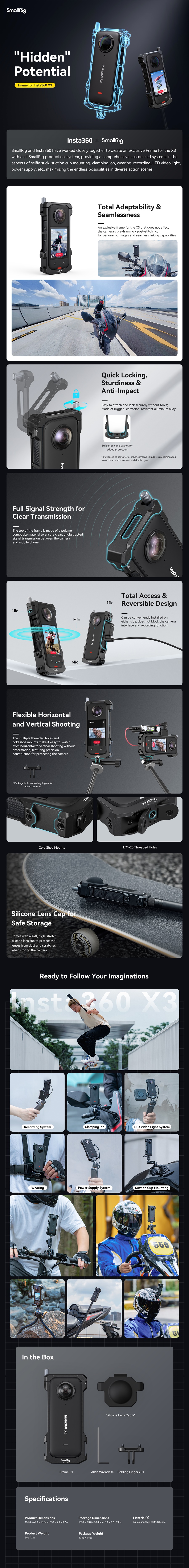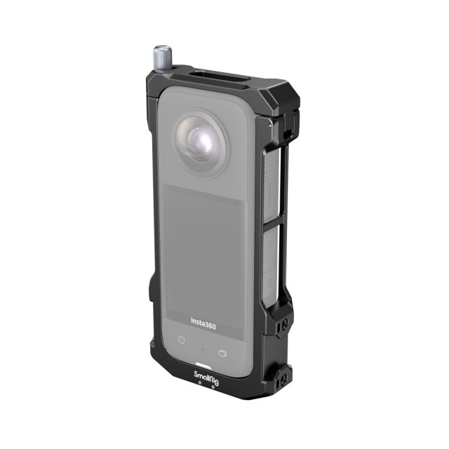 El marco SmallRig para Insta360 X3 4088B protege la cámara y facilita la grabación al ofrecer diversas opciones de fijación de accesorios. El marco, que se ajusta perfectamente a la forma de la cámara, está equipado con almohadillas de silicona que evitan los arañazos y, mediante un tornillo de mariposa, fija de forma segura la cámara, que se inserta en el marco desde su parte superior. A ambos lados hay dos soportes para accesorios, como micrófonos y luces. En ambos lados hay unas garras plegables incluidas para la instalación de palos selfies, bases, etc. Las garras plegables integradas en la parte inferior tienen un orificio roscado de 1/4"-20 para trípode. Además, el paquete incluye una tapa para el objetivo que evita que se raye.