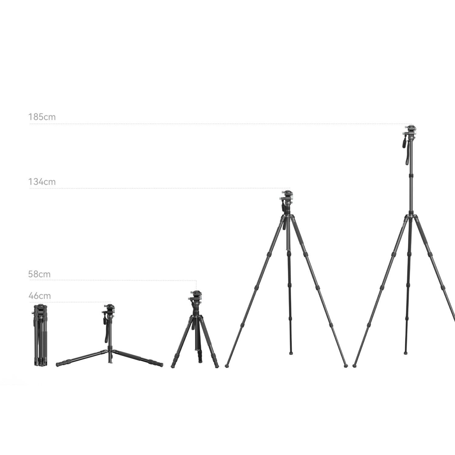 El kit de trípode para vídeo SmallRig CT195 4307 está cuidadosamente diseñado para la grabación de vídeos, retransmisiones en directo, vlogs, etc., especialmente en exteriores. Cuenta con patas plegables inversas de aleación de aluminio, que se pueden plegar hasta 46 cm, y un poste central para aumentar la estabilidad. Las patas de cuatro secciones con cierres de botón permiten ajustar la altura de trabajo hasta 185 cm en cuestión de segundos, y el poste central extraíble se puede girar para realizar tomas desde un ángulo bajo. Al desmontar una de las patas y acoplarla al cabezal, puedes convertir el trípode en un monopié. Dispone de un botón con tres posiciones (23° / 55° / 79°) para ajustar rápidamente el ángulo según tus necesidades. En cuanto al cabezal de vídeo 4104 situado en la parte superior, permite cambiar rápidamente entre la orientación horizontal y vertical, así como la dirección de montaje de la placa de fijación rápida, la jaula de soporte y la consola en L. También está equipada con un mango telescópico desmontable, que se guarda fácilmente y permite un giro estable del cabezal de 360° y una inclinación de +90°/-90°.