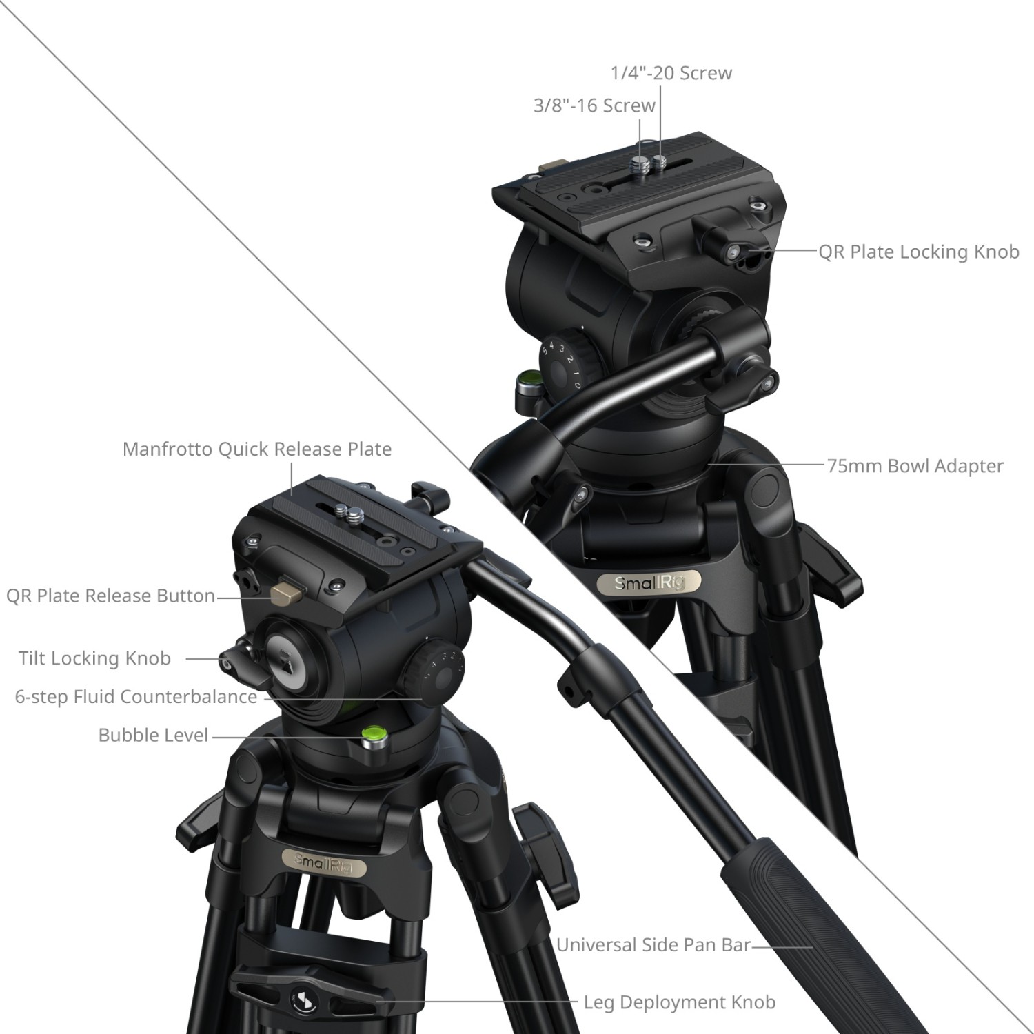 El trípode SmallRig FSD16 FreeSpeed Heavy-Duty, fabricado en aleación de aluminio 5579, está diseñado para cineastas profesionales que buscan estabilidad, versatilidad y la posibilidad de grabar desde un ángulo elevado. Sus patas de tres secciones de aleación de aluminio (Ø16 mm) con una configuración de segmentos 2-2-1 proporcionan una base robusta, mientras que la placa de 75 mm estándar garantiza la compatibilidad con una amplia gama de cabezales fluidos y placas de fijación rápida. El sencillo manejo de las patas permite un ajuste rápido de la altura, lo que agiliza el trabajo sobre el terreno.