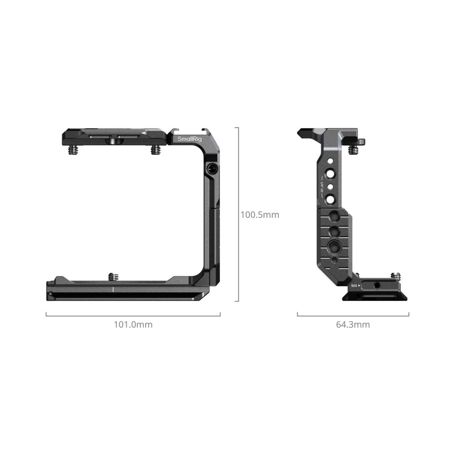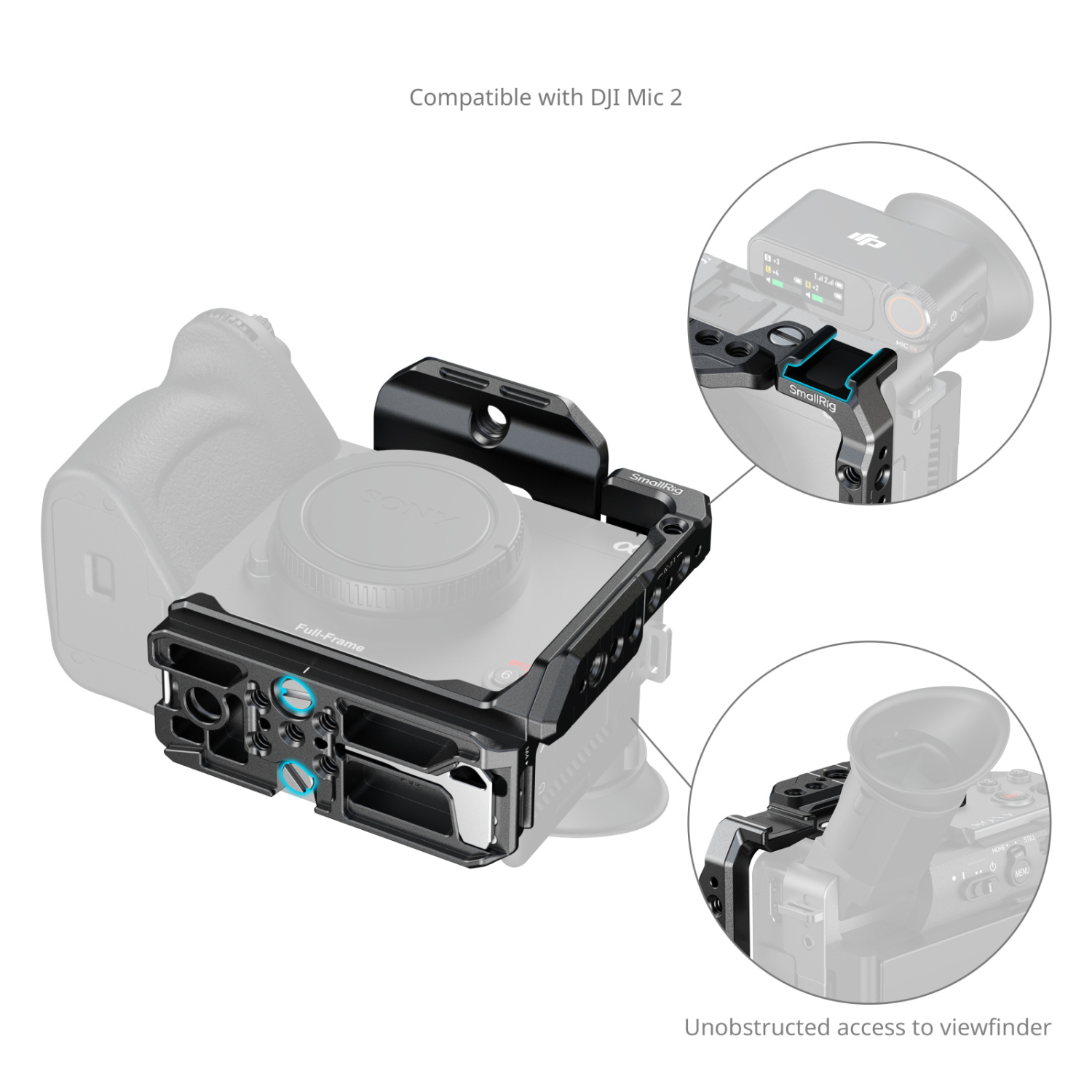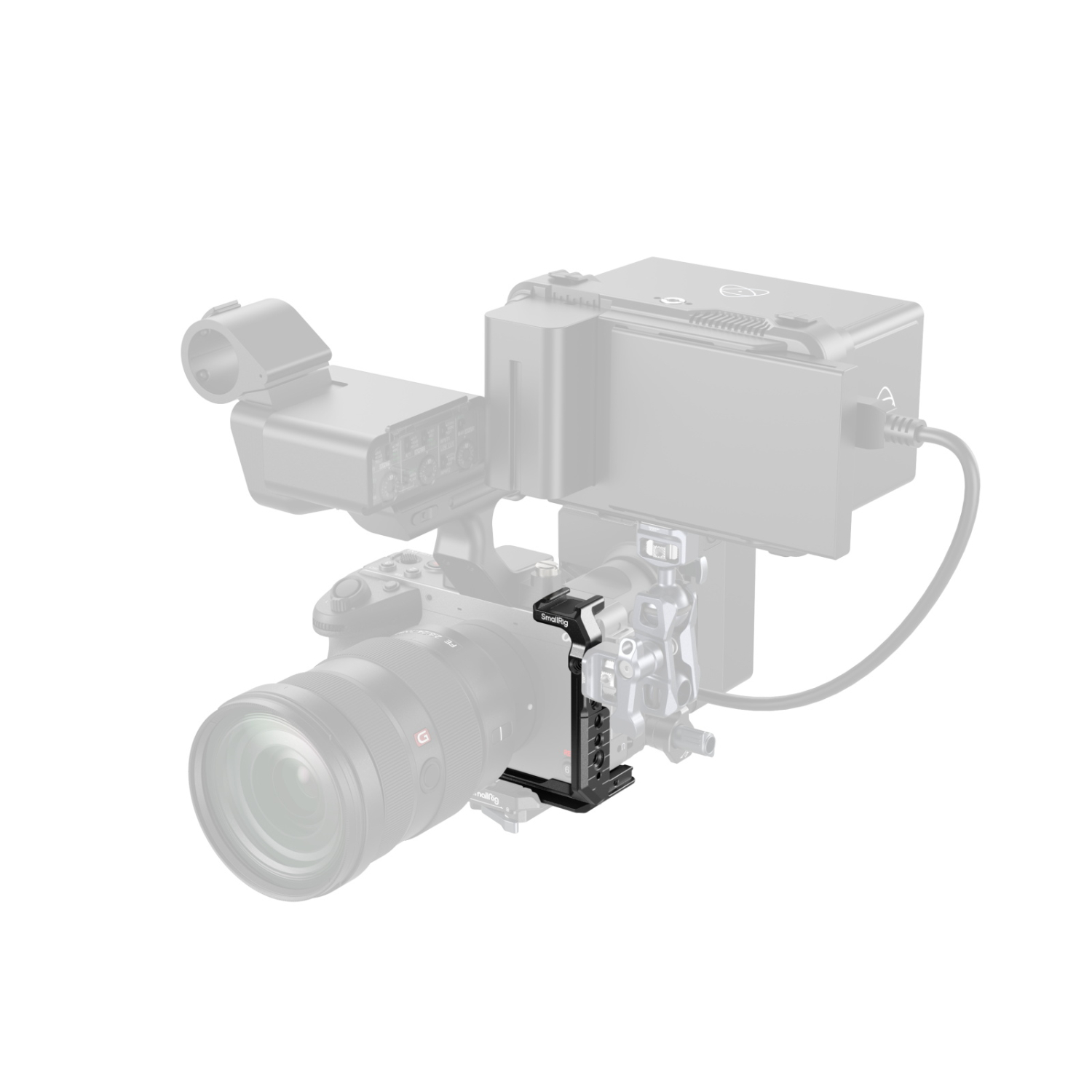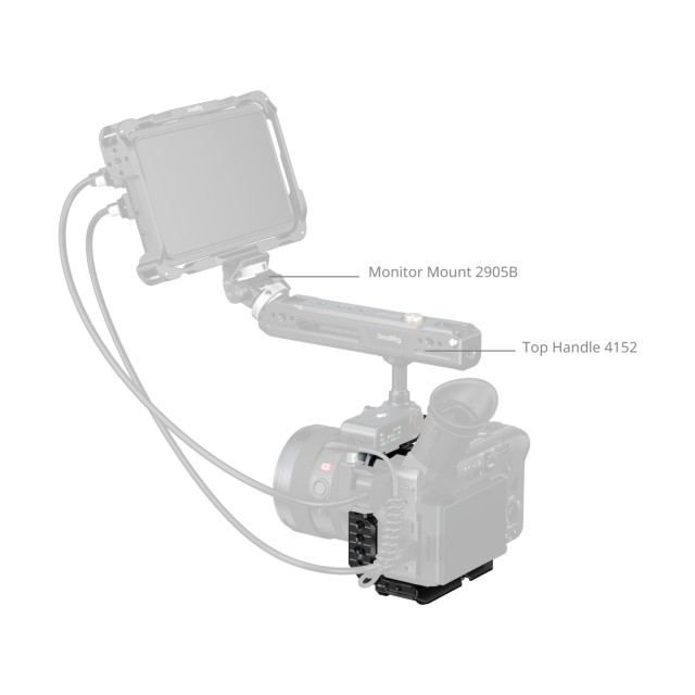 La placa superior extraíble está equipada con un riel NATO que admite la empuñadura superior Sony XLR o la empuñadura superior giratoria SmallRig (ID 4152) sin interferir con el EVF. Gracias a sus precisos recortes, esta jaula garantiza un acceso total al EVF abatible, a los botones y a los puertos de la cámara.