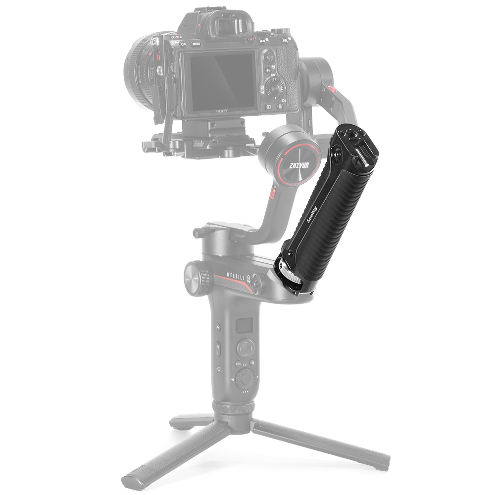 La empuñadura SmallRig para el cardán Zhiyun-Tech WEEBILL-S BSS2636 está diseñada para añadir soporte y puntos de fijación para accesorios al cardán manual WEEBILL LAB. Esta empuñadura ergonómica permite grabar desde diferentes ángulos, incluyendo tomas desde ángulos altos o bajos. Está equipada con roscas para accesorios de 1/4"-20, 3/8"-16 y roscas tipo ARRI, así como con un soporte para zapata fría en un extremo para montar accesorios adicionales. La empuñadura cuenta con un tornillo de 1/4"-20 y dos pasadores de posicionamiento para una conexión segura al cardán, evitando que se retuerza. El acolchado de goma en la parte superior protege el gimbal de arañazos.
