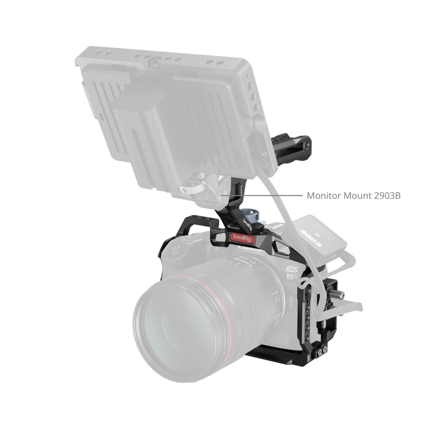El kit de jaula SmallRig para Canon EOS R5 / R6 / R5 C 3830C está diseñado para facilitar la filmación desde ángulos bajos, proteger la cámara y proporcionar puntos de fijación para accesorios. El kit incluye una jaula especial completa, una abrazadera para cables y una empuñadura superior ARRI. La jaula fija la cámara mediante un tornillo y dos pasadores de posicionamiento para evitar que gire.