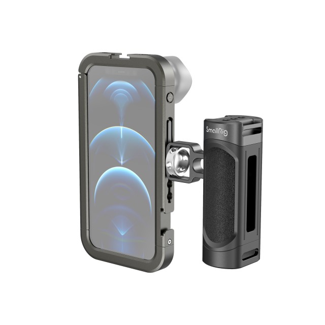 El SmallRig Handheld Video Rig para iPhone 12 Pro 3175 es el soporte perfecto para teléfonos móviles y para grabar vlogs, vídeos con el móvil, anuncios, etc. El kit incluye una carcasa diseñada específicamente para el iPhone 12 Pro y un asa lateral que permite grabar con mayor estabilidad al sostener el teléfono con la mano. Cuenta con dos soportes de fijación y varios orificios roscados de 1/4 para acoplar accesorios como micrófonos, luces LED, trípodes, etc. Admite grabación tanto en horizontal como en vertical. El soporte para objetivos situado en la parte trasera permite acoplar fácilmente un objetivo externo al teléfono.