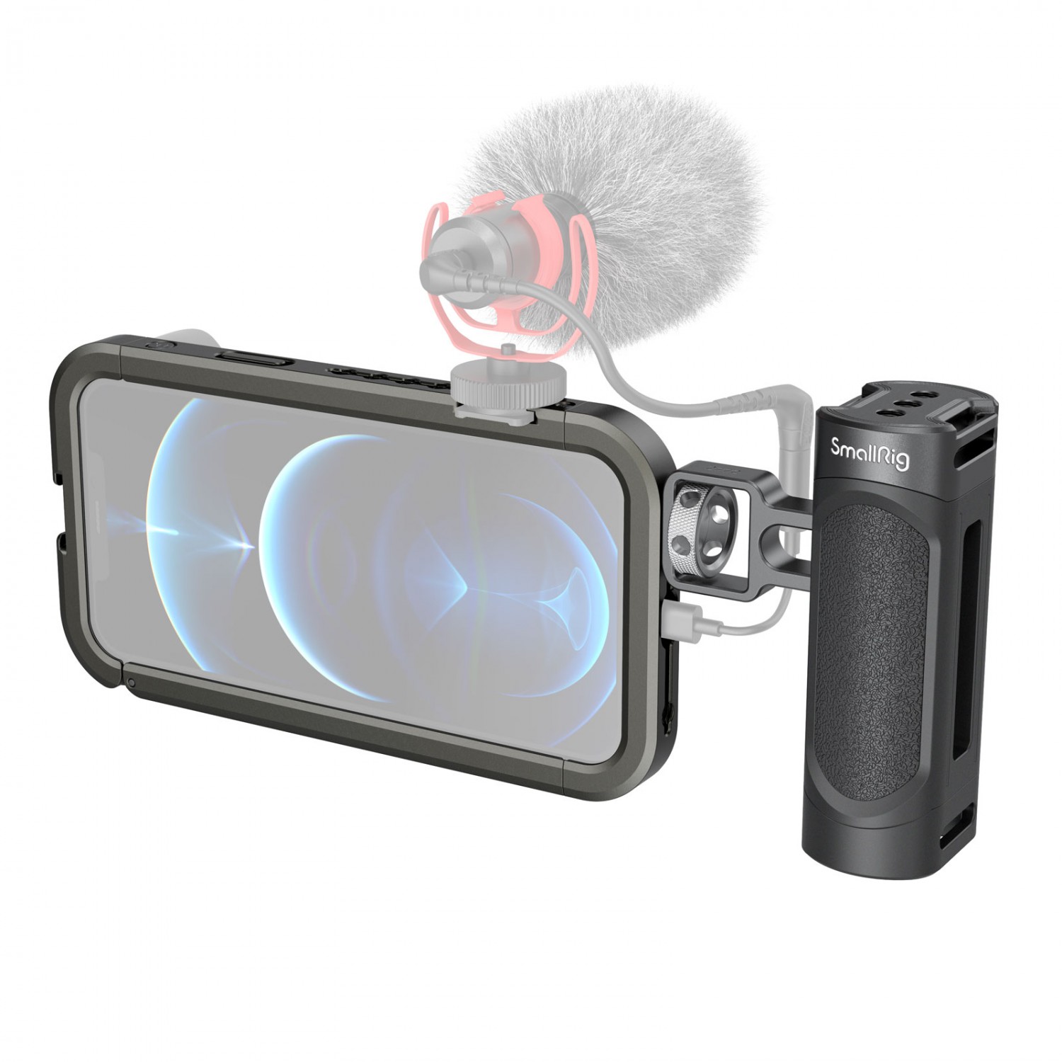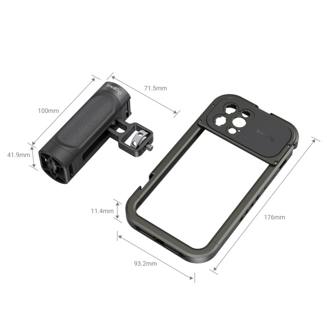 El kit de soporte de vídeo portátil SmallRig para iPhone 12 Pro Max 3176 es perfecto para grabar vlogs, vídeos con el móvil, anuncios, etc. El kit incluye una carcasa diseñada específicamente para el iPhone 12 Pro Max y un asa lateral que permite grabar con el móvil de forma más estable. Está equipado con dos zapatas y varios orificios roscados de 1/4 para conectar accesorios, como un micrófono, una luz LED, un trípode, etc. Admite la grabación tanto en horizontal como en vertical. El soporte para objetivos situado en la parte trasera permite acoplar fácilmente un objetivo externo al teléfono.