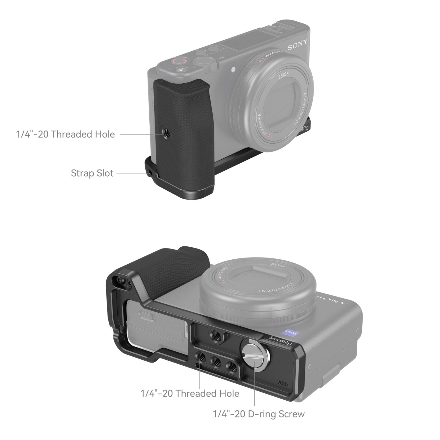 El mango SmallRig para Sony ZV-1F 4146 está diseñado para mejorar el agarre, proteger la parte inferior de la jaula y facilitar la grabación en vertical. El mango ergonómico de silicona se fija mediante un tornillo de 1/4"-20 con anilla en D, ofrece un agarre más firme que evita caídas accidentales y cuenta con un orificio roscado de 1/4"-20 en el lado derecho, en el centro del objetivo, para el agarre inalámbrico 3326, ideal para la fotografía en modo vertical. La empuñadura también cuenta con orificios con rosca de 1/4"-20 en la parte inferior para fijar una placa de fijación rápida y orificios para la correa en la placa inferior para la correa de mano PSW2398.