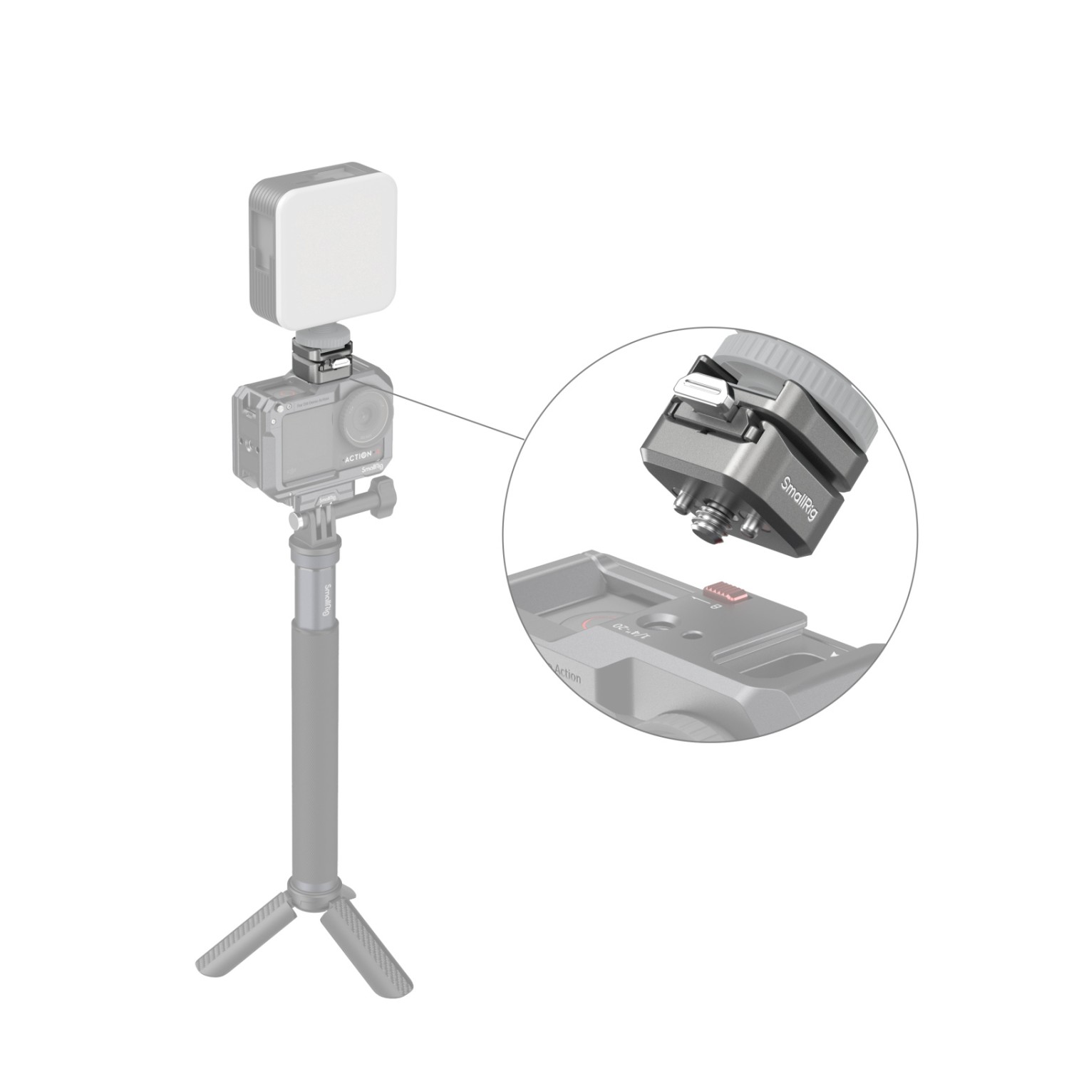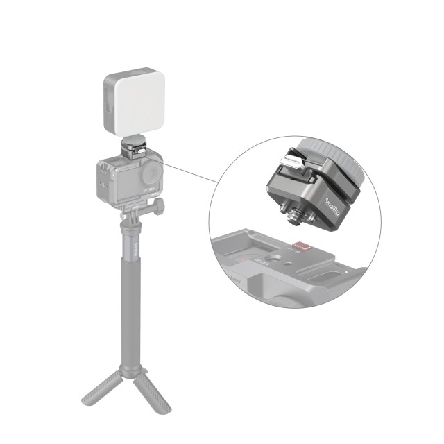 El soporte de fijación rápida SmallRig HawkLock H18 con zapata Cold Shoe 4500 consta de un adaptador de fijación rápida para zapata Cold Shoe y una placa base de fijación rápida para zapata Cold Shoe. Con un solo clic, el pestillo antideslizamiento situado en la parte inferior del adaptador de fijación rápida, en combinación con el diseño de la ranura en la parte superior de la placa base, bloquea la zapata en su sitio, lo que evita eficazmente que se deslice y garantiza un montaje fluido y seguro. Soporta hasta 800 g. La parte superior del adaptador de fijación rápida está equipada con almohadillas de silicona que evitan que se rayen los accesorios y, al mismo tiempo, garantizan una unión más estable y reducen las vibraciones. El adaptador puede convertir los accesorios comunes de zapata fría (como luces LED de vídeo, micrófonos, etc.) en accesorios con un diseño de fijación rápida, lo que resulta más eficaz y ahorra tiempo. La placa base está equipada con pasadores de posicionamiento con resorte para soportar jaulas de cámaras de acción SmallRig, como las 4119B, 3084C, 4088B y otras con orificios de posicionamiento, lo que garantiza la seguridad y la estabilidad.