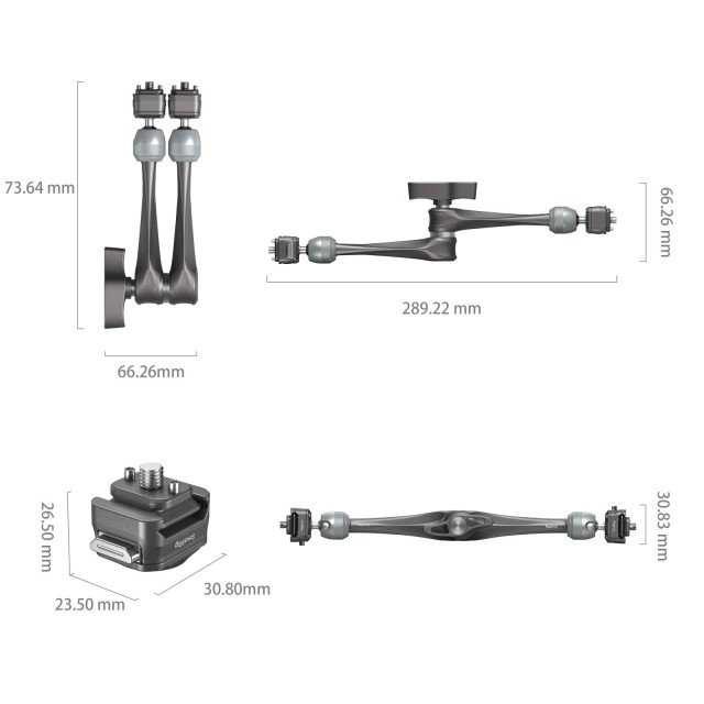El brazo de fijación rápida SmallRig HawkLock H21 Rosette Magic Arm (11") 4489 está fabricado en aleación de aluminio aeronáutico y acero inoxidable. Cuenta con un diseño exclusivo y patentado de deslizador de fijación rápida con pasadores de rodadura internos que permiten un bloqueo vertical seguro. El diseño con dos tornillos de fijación rápida de 1/4"-20…