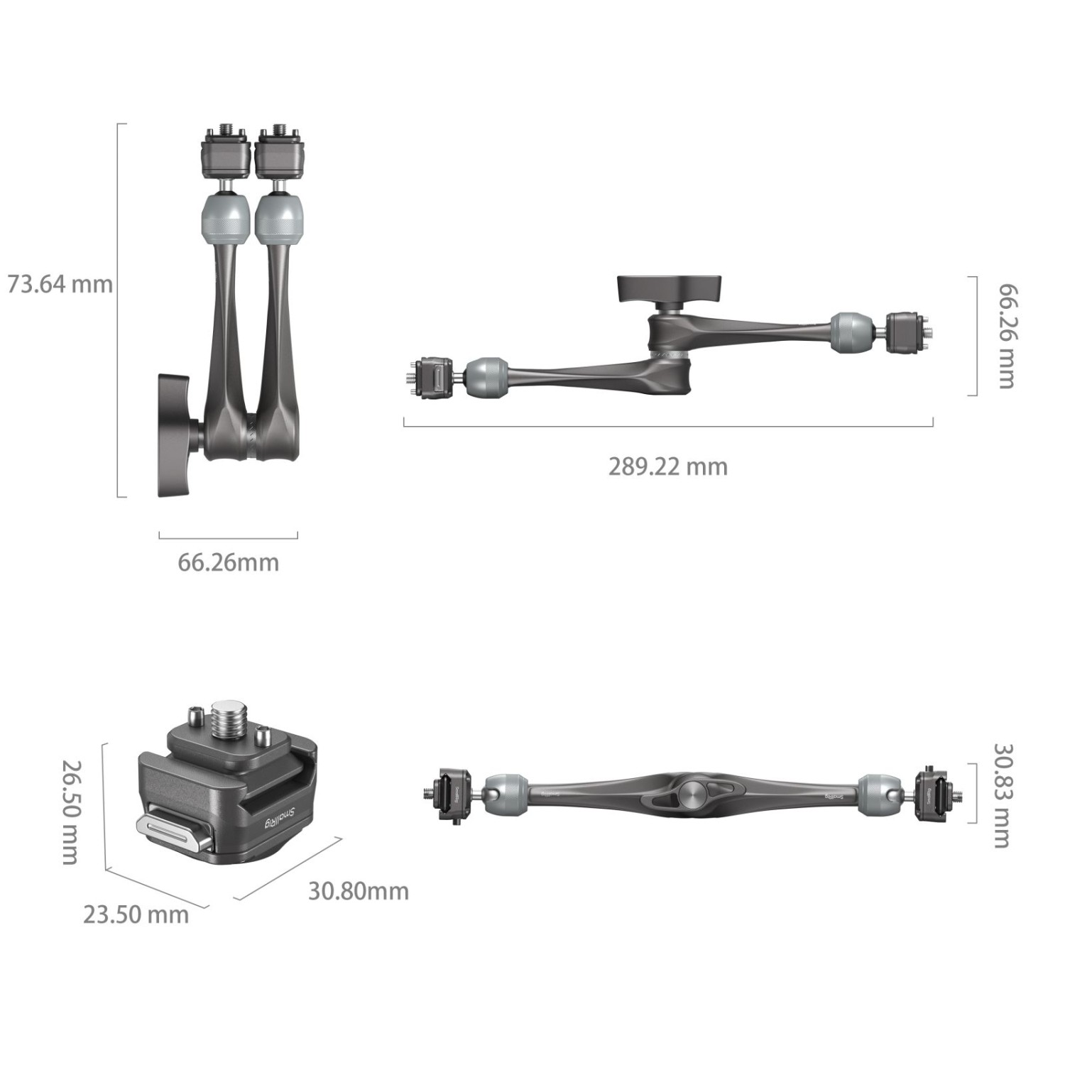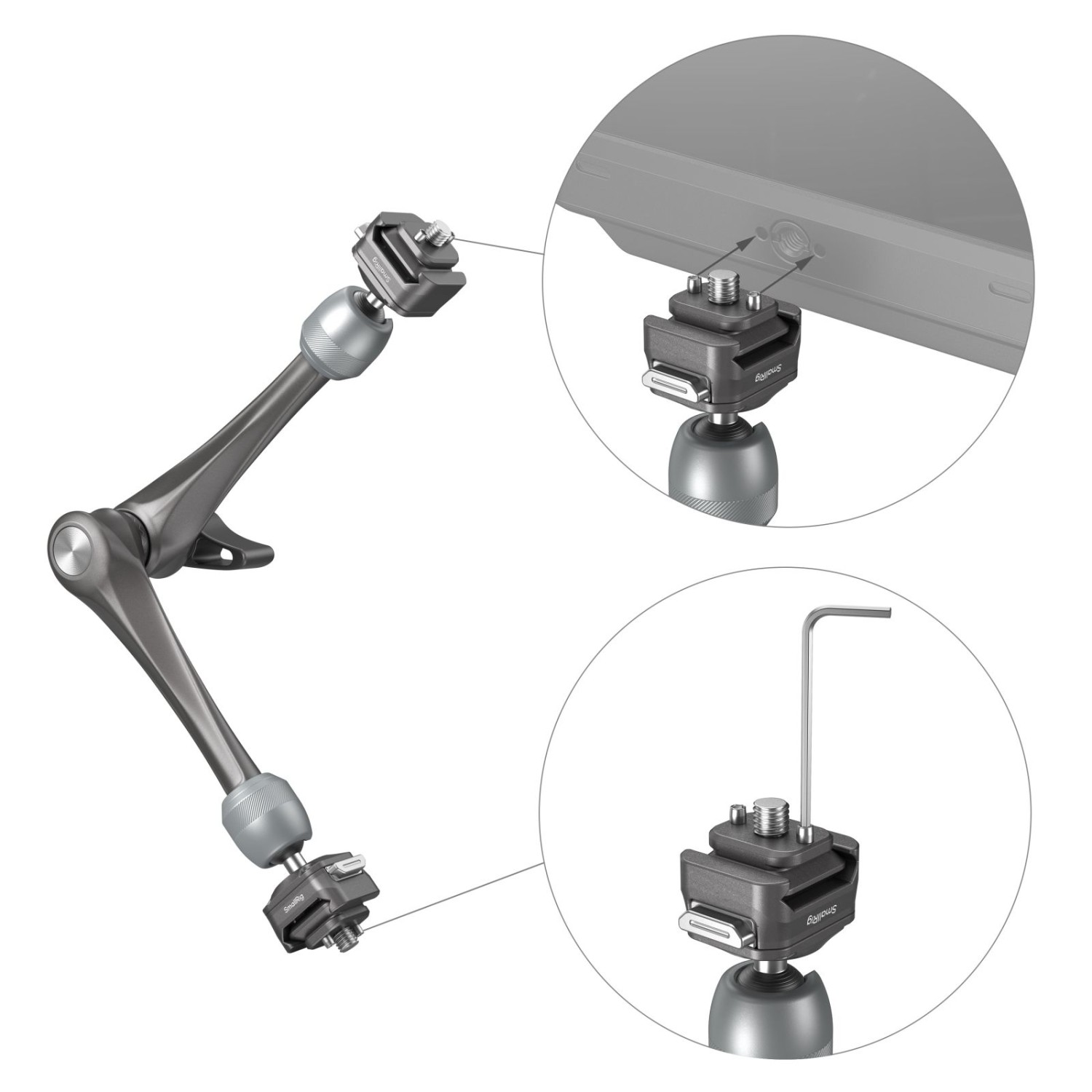 El brazo de fijación rápida SmallRig HawkLock H21 Rosette Magic Arm (11") 4489 está fabricado en aleación de aluminio aeronáutico y acero inoxidable. Cuenta con un diseño exclusivo y patentado de deslizador de fijación rápida con pasadores de rodadura internos que permiten un bloqueo vertical seguro. El diseño con dos tornillos de fijación rápida de 1/4"-20 permite la fijación externa de monitores, luces de vídeo, micrófonos, teléfonos inteligentes, iPads, cámaras de acción y otros dispositivos.