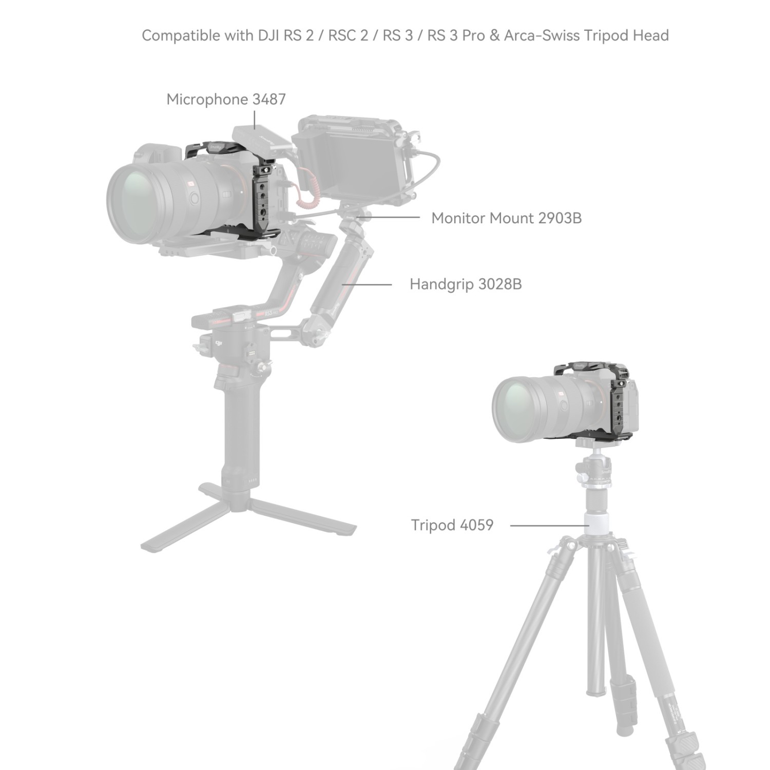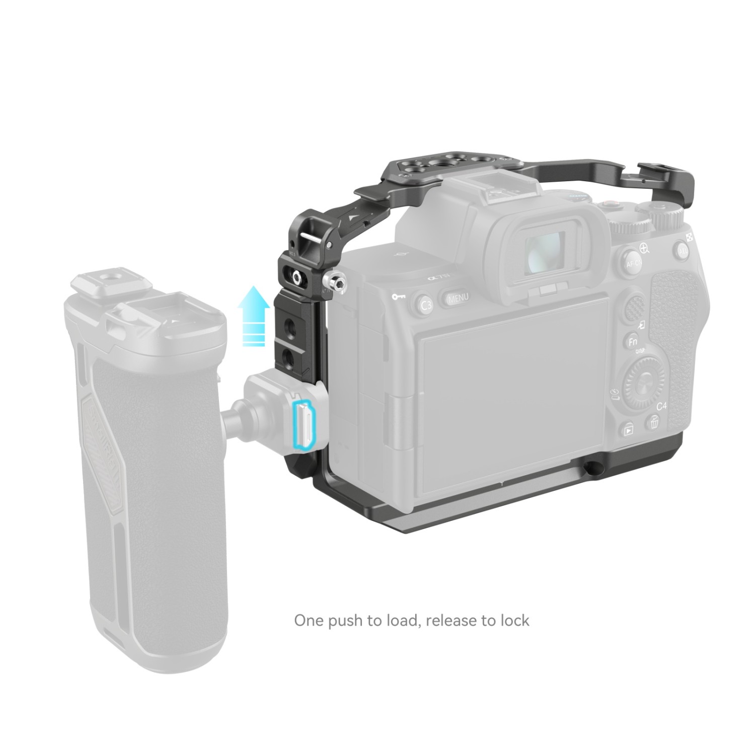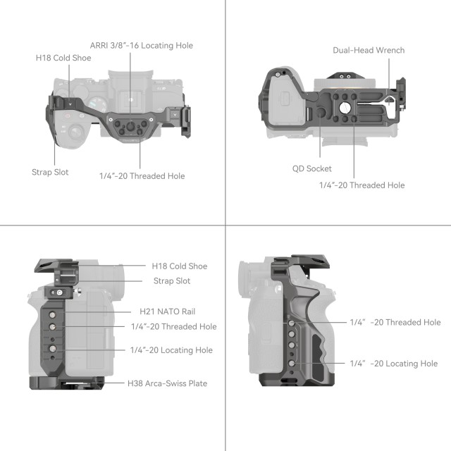La jaula de fijación rápida SmallRig HawkLock para Sony Alpha 7R V / Alpha 7 IV / Alpha 7S III / Alpha 1 / Alpha 7R IV 4481 está diseñada para fijar accesorios y proteger la cámara. La estructura de fijación rápida patentada y desarrollada de forma independiente (denominada HawkLock) cubre las zapatas, la guía NATO y Arca Swiss, y se utiliza con los accesorios ecológicos HawkLock para lograr una posición firme y sin holguras; se carga con una sola pulsación, se bloquea al soltarla y mejora la eficiencia del desmontaje. Fija la cámara mediante un pasador de posicionamiento inferior, un tornillo de 1/4"-20 y un tornillo M2,5 en el lado izquierdo.