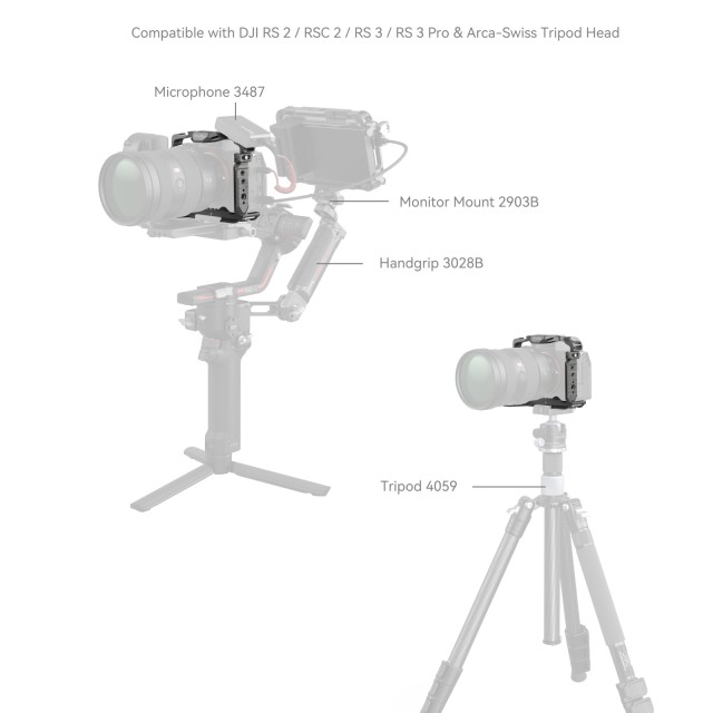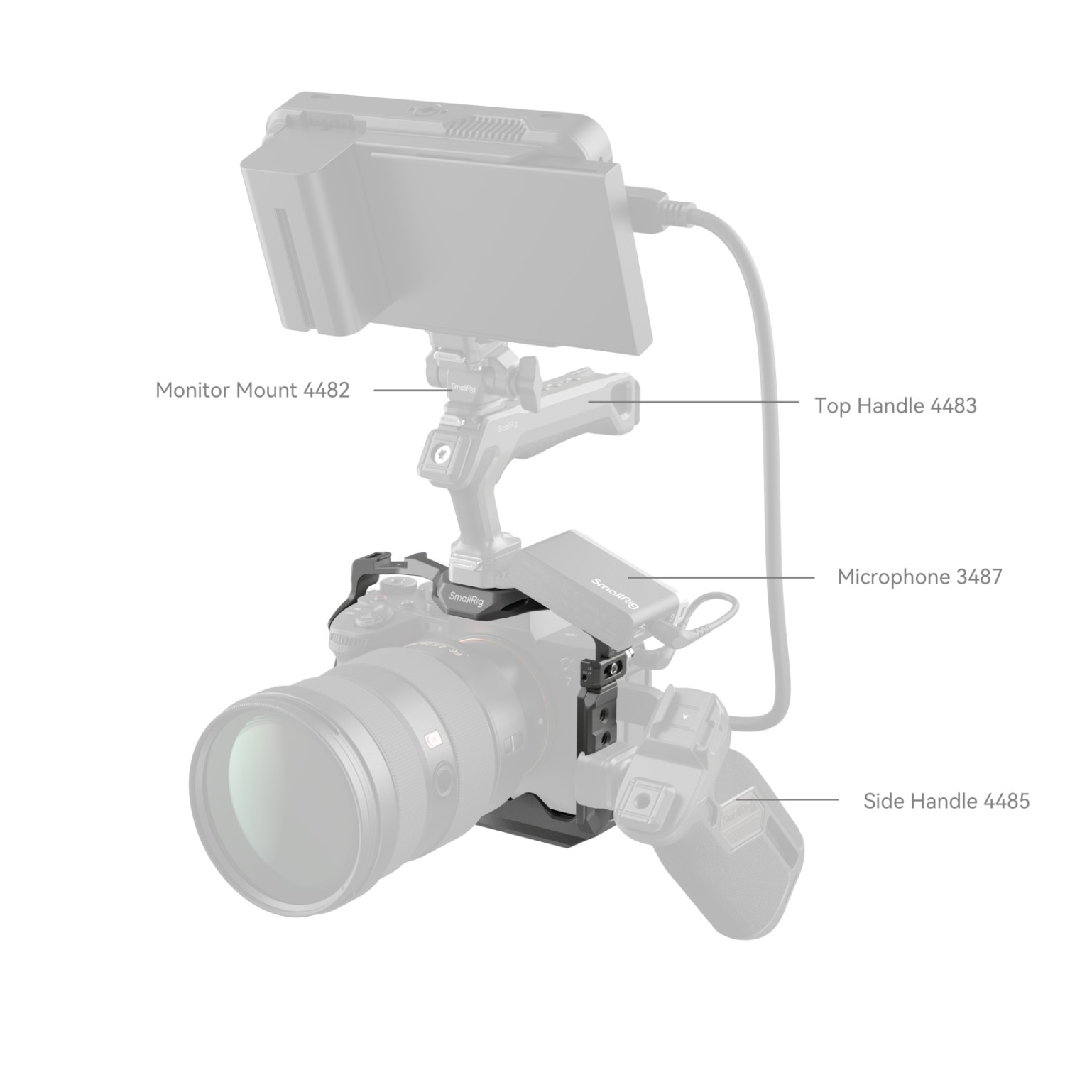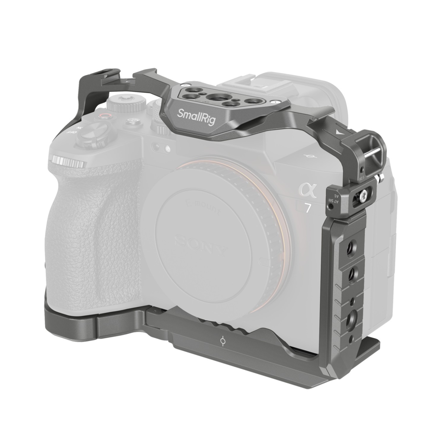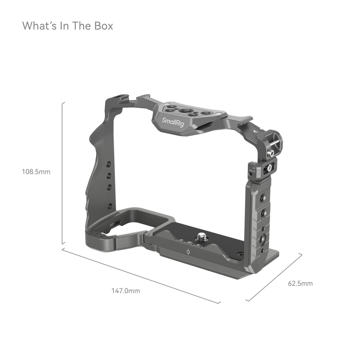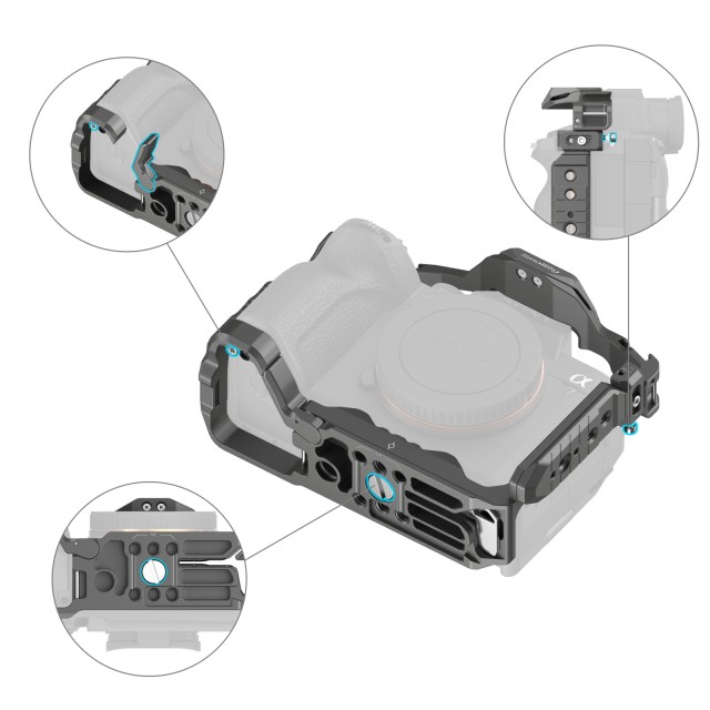 La jaula de fijación rápida SmallRig HawkLock para cámaras Sony Alpha 7R V / Alpha 7 IV / Alpha 7S III / Alpha 1 / Alpha 7R IV 4481 está diseñada para fijar accesorios y proteger la cámara. Su diseño de fijación rápida patentado y desarrollado de forma independiente (denominado HawkLock) cubre las zapatas, el riel NATO y el Arca Swiss, y se utiliza con los accesorios ecológicos HawkLock para lograr una posición firme y sin holguras; se carga con una sola pulsación, se bloquea al soltarla y mejora la eficiencia del desmontaje. Fija la cámara mediante un pasador de posicionamiento inferior, un tornillo de 1/4"-20 y un tornillo M2,5 en el lado izquierdo. Los adaptadores del cierre lateral deben ajustarse en la dirección de instalación para adaptarse a los distintos tipos de cámaras; la inscripción impresa «A7 IV» está destinada a la Alpha 7 IV y la Alpha 7R V, mientras que la inscripción impresa «A7S III» está destinada a la Alpha 7S III / Alpha 1 / Alpha 7R IV. Las arandelas protectoras versátiles integradas evitan que se raye la cámara. La jaula permite acceder a las interfaces, controles, botones o tapas de la batería. En el espacio para la batería hay una llave de husillo que se adapta a la curvatura de la cámara y deja espacio para el meñique, lo que permite un agarre cómodo. Los orificios roscados de 1/4"-20, los orificios de fijación ARRI de 3/8"-16 y los soportes HawkLock cold shoe admiten la empuñadura superior 2165C, la empuñadura lateral 2093, el soporte para monitor 2903, micrófonos, luces LED, monitores, etc. El encaje QD inferior es compatible con la correa para el hombro QD. La placa de fijación rápida HawkLock Arca-Swiss en la parte inferior es compatible con DJI RS 2 / RSC 2 / RS 3 / RS 3 Pro, con la placa de elevación (riser plate) del estabilizador DJI RS 2/RSC 2 para grabar con estabilizador y con la placa de fijación rápida Arca-Swiss 3154. Los orificios en los laterales y la parte inferior de la jaula permiten fijar accesorios como la correa de mano PAC2456. Además, la jaula está equipada con una llave magnética integrada que facilita el desmontaje y el montaje.