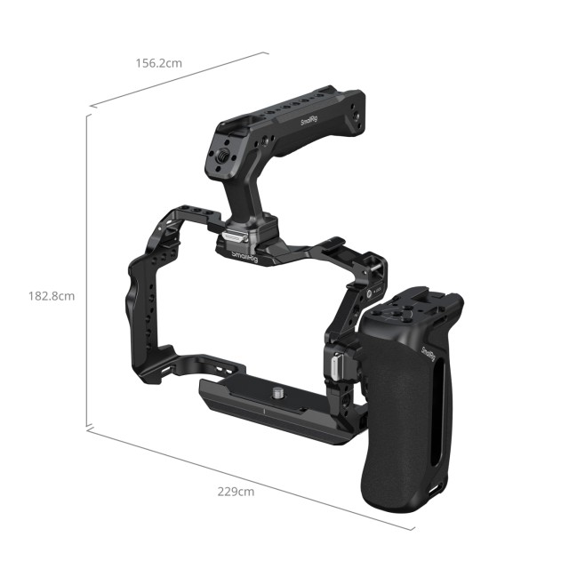 La jaula mantiene un acceso completo a los controles de la cámara, incluyendo el compartimento de la batería, las ranuras para tarjetas y los puertos, incluso cuando los cables están conectados. La base de montaje en la jaula, el asa superior y el asa lateral proporcionan puntos de montaje cómodos para accesorios adicionales, lo que convierte a este kit en una solución versátil tanto para configuraciones fotográficas como de vídeo.