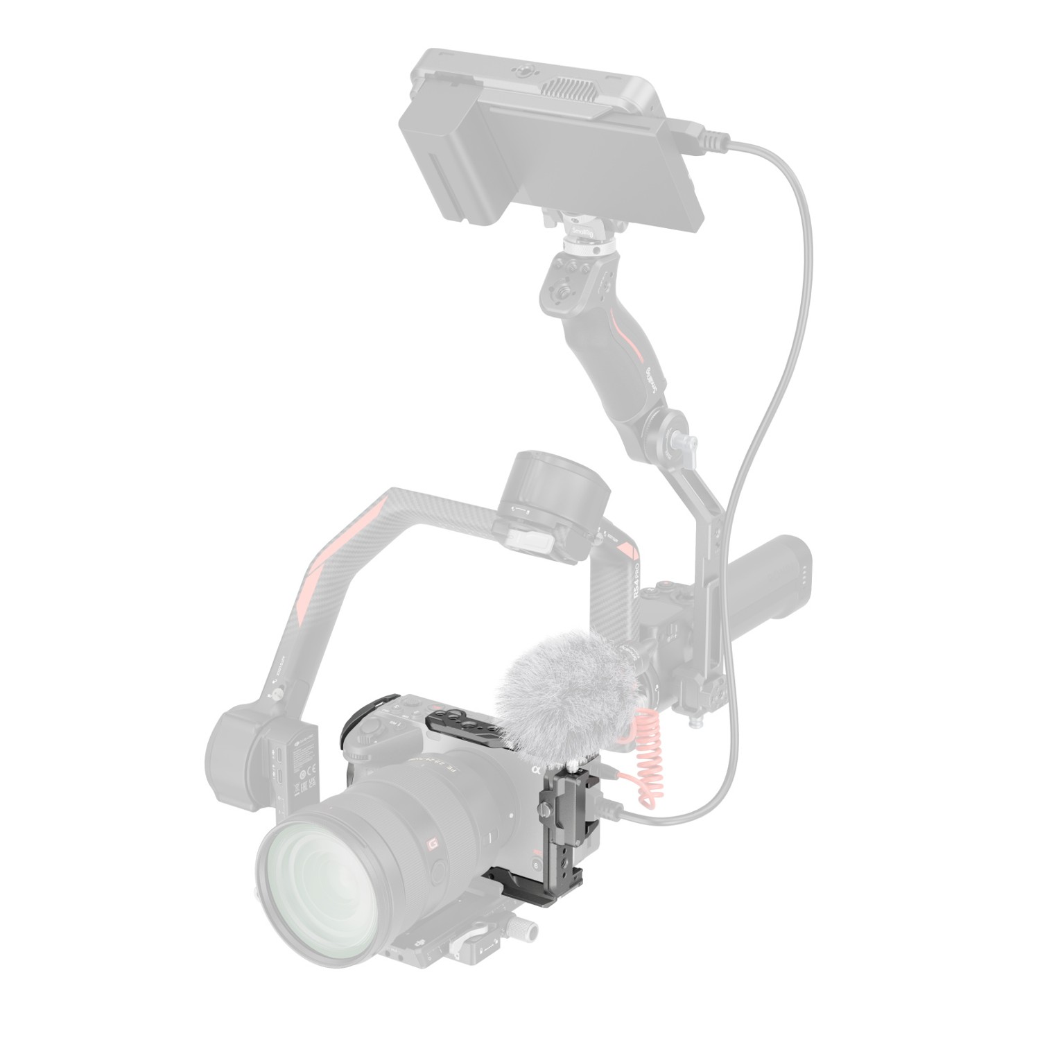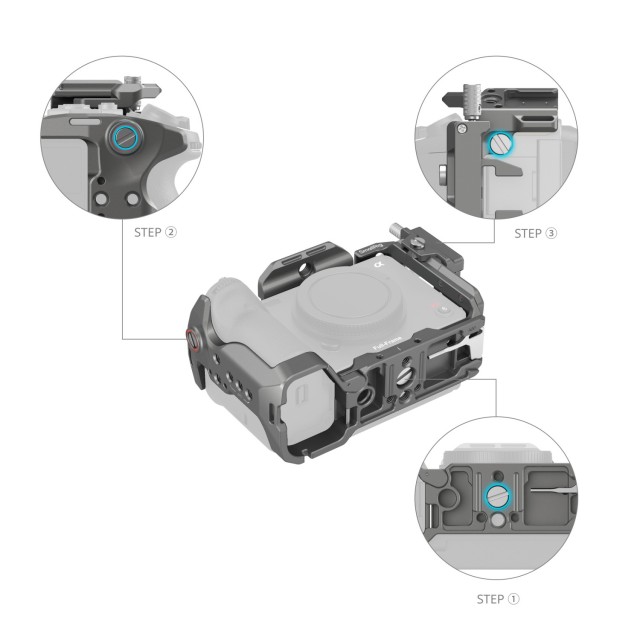El kit de jaula de fijación rápida SmallRig HawkLock para Sony FX3 / FX30 4770 está diseñado para proteger la cámara y proporcionar puntos de montaje para accesorios. La jaula modular consta de un riel NATO y una jaula en forma de U. El riel NATO está fijado en la parte superior con dos tornillos de 1/4"-20 y se retira para poder instalar la empuñadura superior XLR original; la jaula en forma de U se fija con tornillos de 1/4"-20 a ambos lados y en la parte inferior para evitar que se deforme, con protección contra arañazos. En la tapa de la batería, el brazo de la bisagra se adapta a la curvatura de la cámara para facilitar el agarre con el meñique. Una abrazadera especial para el cable HDMI protege la interfaz y garantiza una transmisión estable de la señal.