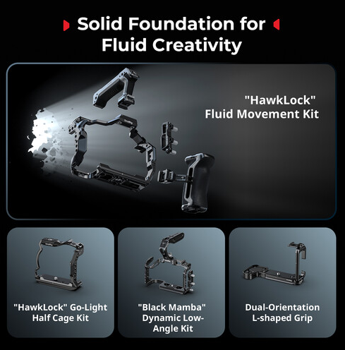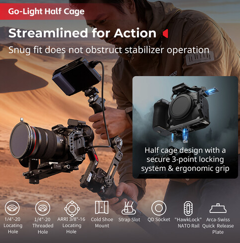 El sistema de bloqueo de 3 puntos fija la cámara a la jaula mediante un tornillo exterior de 1/4"-20 y dos orificios de posicionamiento laterales, lo que garantiza una fijación estable y sin torsión. El conector QD (Quick Detach) permite retirar la jaula de forma rápida y sencilla cuando sea necesario. Además, dispone de un soporte de zapata fría para fijar accesorios ligeros y una ranura para una correa de muñeca o de hombro.