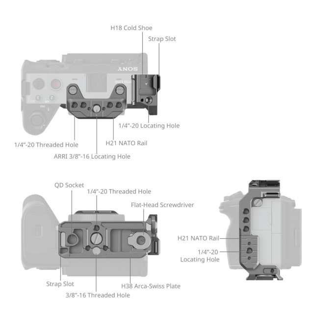 La jaula de medio tamaño de montaje rápido SmallRig HawkLock para Sony FX3 / FX30 4772 está diseñada para proteger la cámara y proporcionar puntos de montaje para accesorios. La jaula modular consta de una placa superior (riel NATO) y una jaula en forma de L. El riel NATO se fija en la parte superior mediante dos tornillos de 1/4"-20 y se retira para poder instalar el soporte superior XLR original; la jaula en forma de L se fija mediante un tornillo de 1/4"-20 en el lado izquierdo y en la parte inferior para evitar torsiones, con protección contra arañazos. El diseño de fijación rápida patentado y desarrollado internamente (denominado HawkLock) cubre la zapata fría, el riel NATO y la placa Arca-Swiss.