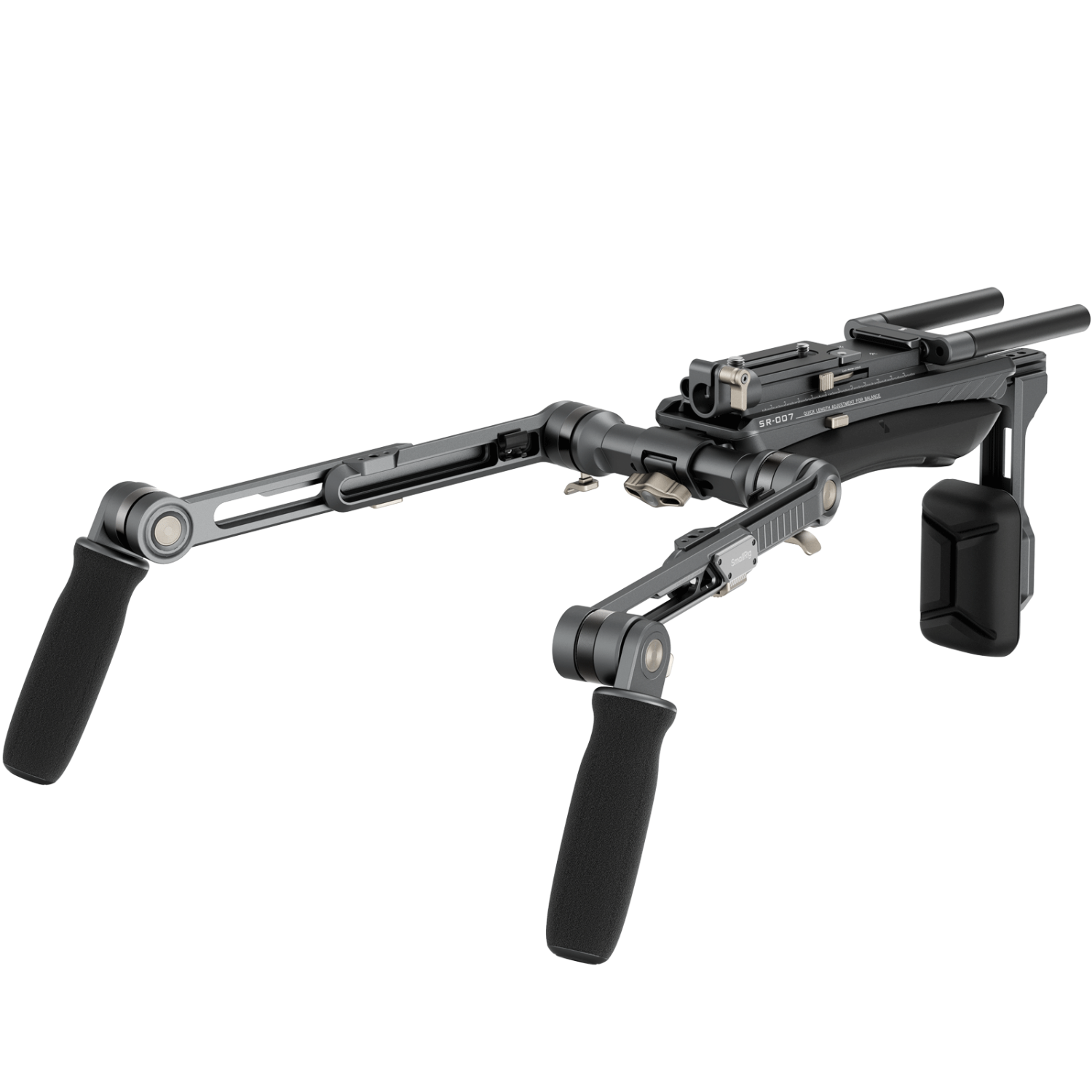 El kit de soporte de hombro está equipado con asas ergonómicas de textura suave que proporcionan un agarre cómodo y facilitan el giro de 360°. El eje de conexión de los brazos extensibles se puede ajustar horizontalmente para un control optimizado, mientras que las almohadillas simplificadas para los hombros y la espalda proporcionan un apoyo excepcional. La almohadilla dorsal se ajusta hasta un ángulo de 90° para adaptarse perfectamente a cualquier ángulo de disparo, y la placa de fijación rápida permite ajustar fácilmente la parte delantera del brazo para un rápido equilibrio.