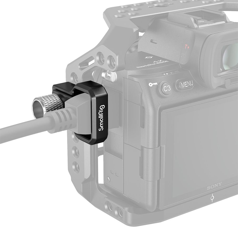 La abrazadera para cable HDMI de SmallRig para la jaula A7S III 3000 es compatible con la jaula SmallRig Cage 2999. Esta abrazadera está diseñada para evitar que el cable HDMI de la cámara se desconecte accidentalmente y se fija al lateral de la jaula mediante un tornillo de 1/4"-20 y dos pasadores antitorsión. El tornillo de 1/4"-20, fácil de agarrar y con estrías, ajusta el bloque deslizante, que se puede apretar para adaptarse a cables HDMI de diferentes diámetros. Esta abrazadera para cable está fabricada en una resistente aleación de aluminio y se suministra con una llave Allen.