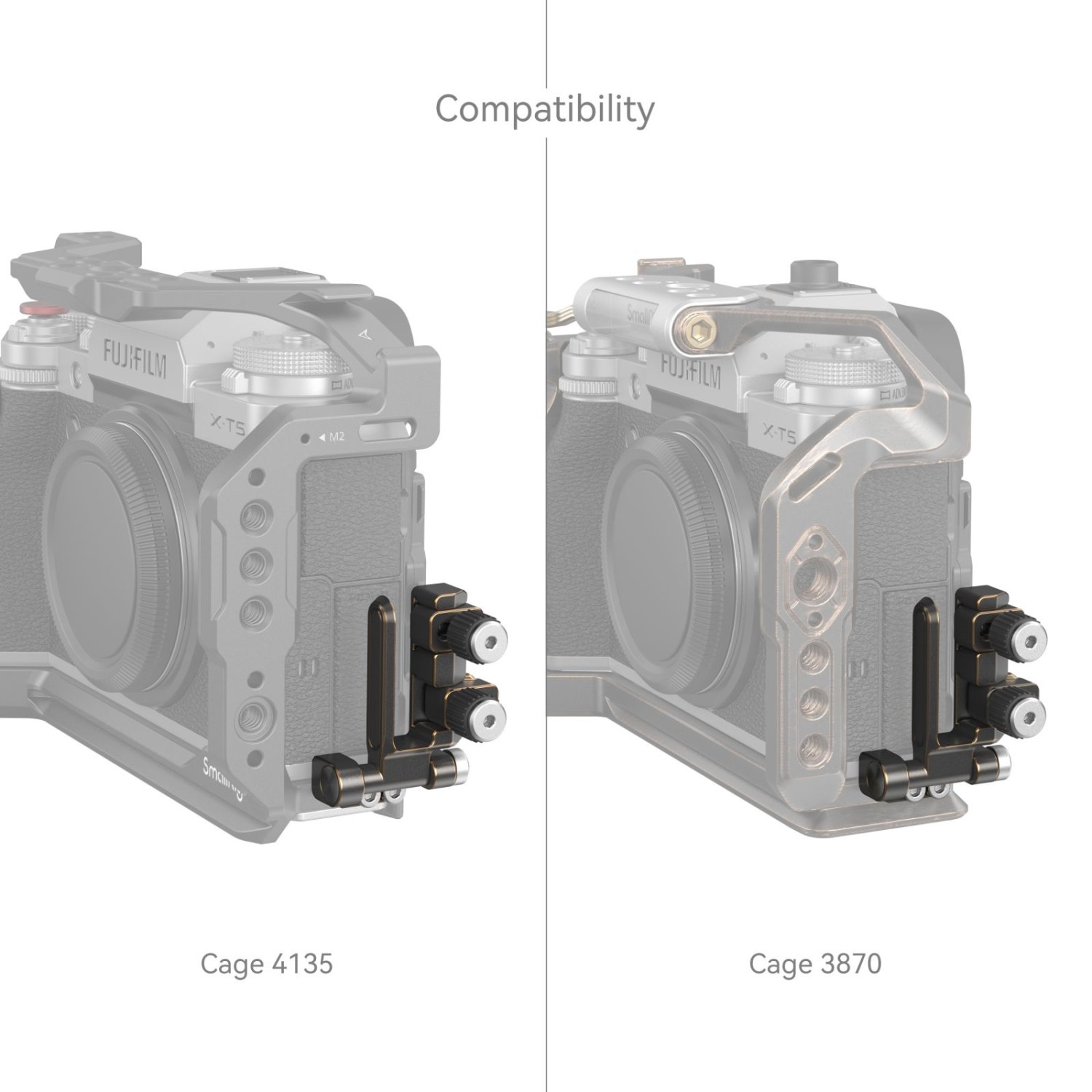 La abrazadera para cables HDMI yUSB-C de SmallRigpara la FUJIFILM X-T5 4147 está diseñada para evitar que el cable se desconecte accidentalmente y garantizar una transmisión estable de la señal. Se fija al lado izquierdo de la jaula Cage 3870 o Cage 4135 mediante dos tornillos M3. Gracias a su nuevo diseño con función de presión y basculación, la abrazadera para cables permite un fácil acceso a la tapa de la interfaz de la cámara y, al mismo tiempo, fija los cables HDMI y USB-C, protegiendo así los puertos.