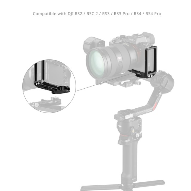La placa inferior de fijación rápida Arca-Swiss es compatible con trípodes de tipo Arca y gimbals DJI RS 2 / RSC 2 / RS 3 / RS 3 Pro / RS 4 / RS 4 Pro, lo que permite una transición fluida entre el rodaje a mano alzada, el estabilizador y el trípode. En la parte inferior también hay un enganche QD para fijar las correas de hombro (ID PSC2428).