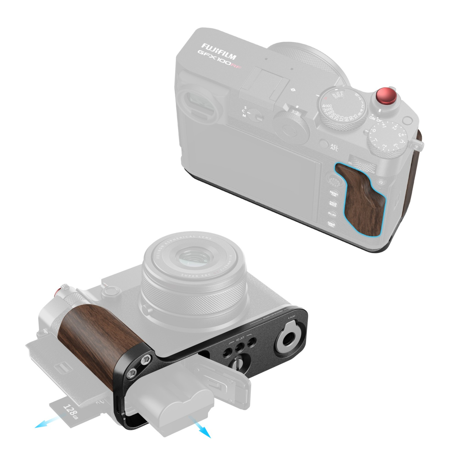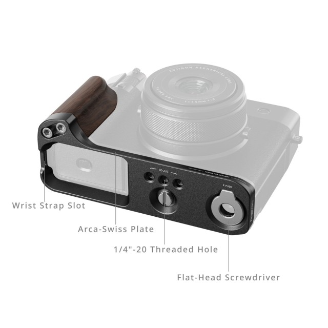 La placa SmallRig en forma de L con empuñadura de madera para la FUJIFILM GFX100RF (negra) 5266 ha sido diseñada por expertos para mejorar tanto la estética como el manejo de tu cámara. Se fija de forma segura mediante un tornillo de 1/4"-20 y cuenta con almohadillas de silicona integradas que evitan los arañazos.