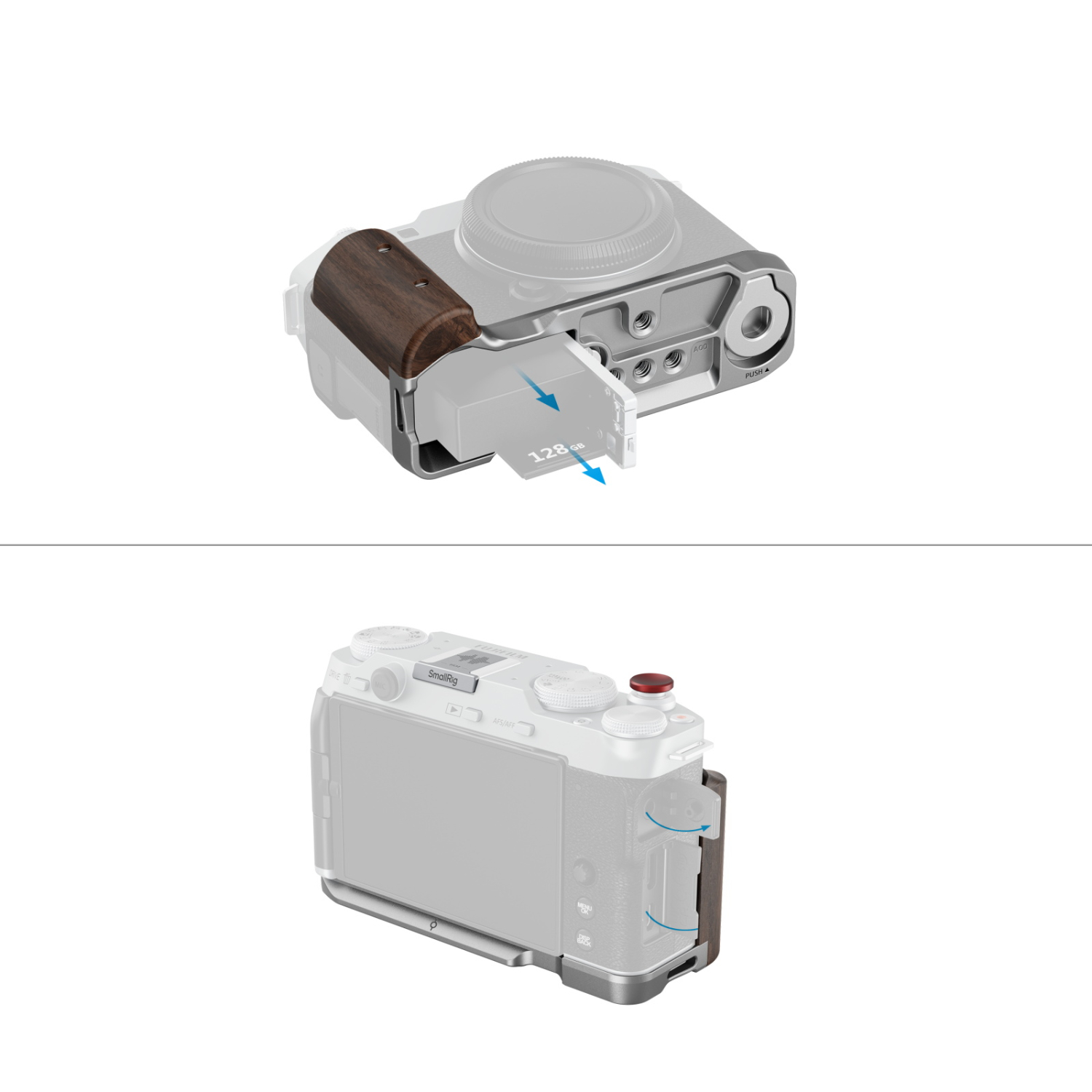 Las placas de montaje en forma de L de SmallRig con empuñadura de madera para la FUJIFILM X-M5 (negra) 5260 y (plateada) 5261 están diseñadas para facilitar el agarre de la cámara.