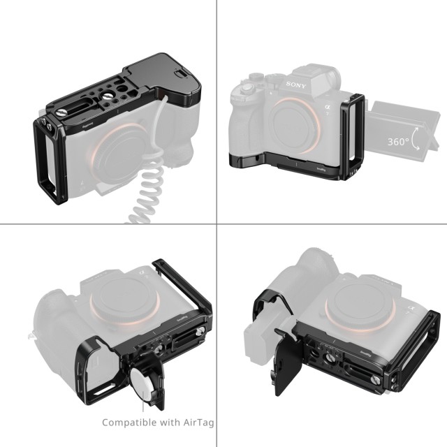 Esta pequeña placa de montaje en forma de L de SmallRig con ranura para AirTag (6034) está diseñada para las Sony Alpha 7 V / 7R V / 7 IV. Está concebida para facilitar el cambio rápido entre la toma horizontal y la vertical. Se fija de forma segura a la cámara mediante un tornillo de 1/4"-20 y está equipada con almohadillas protectoras que evitan los arañazos.