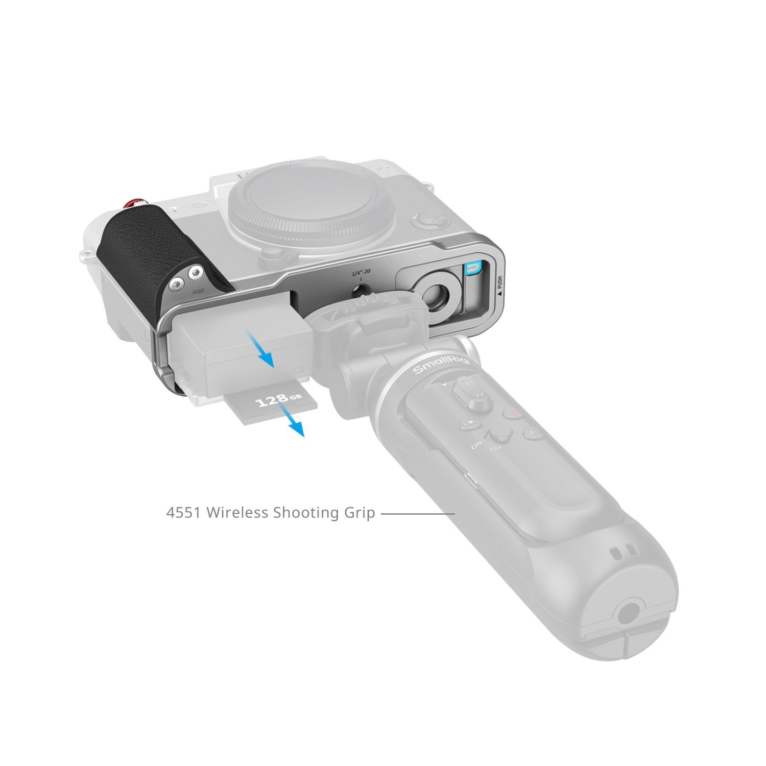 El mango en forma de L mantiene el acceso completo a todas las interfaces de la cámara, incluyendo el compartimento de la batería, el anillo de enfoque, la ranura para la tarjeta de memoria y los puertos de los altavoces. Esta unidad también incluye una llave plana para facilitar el montaje y desmontaje, junto con una cubierta para el disparador que mejora la respuesta táctil al fotografiar.