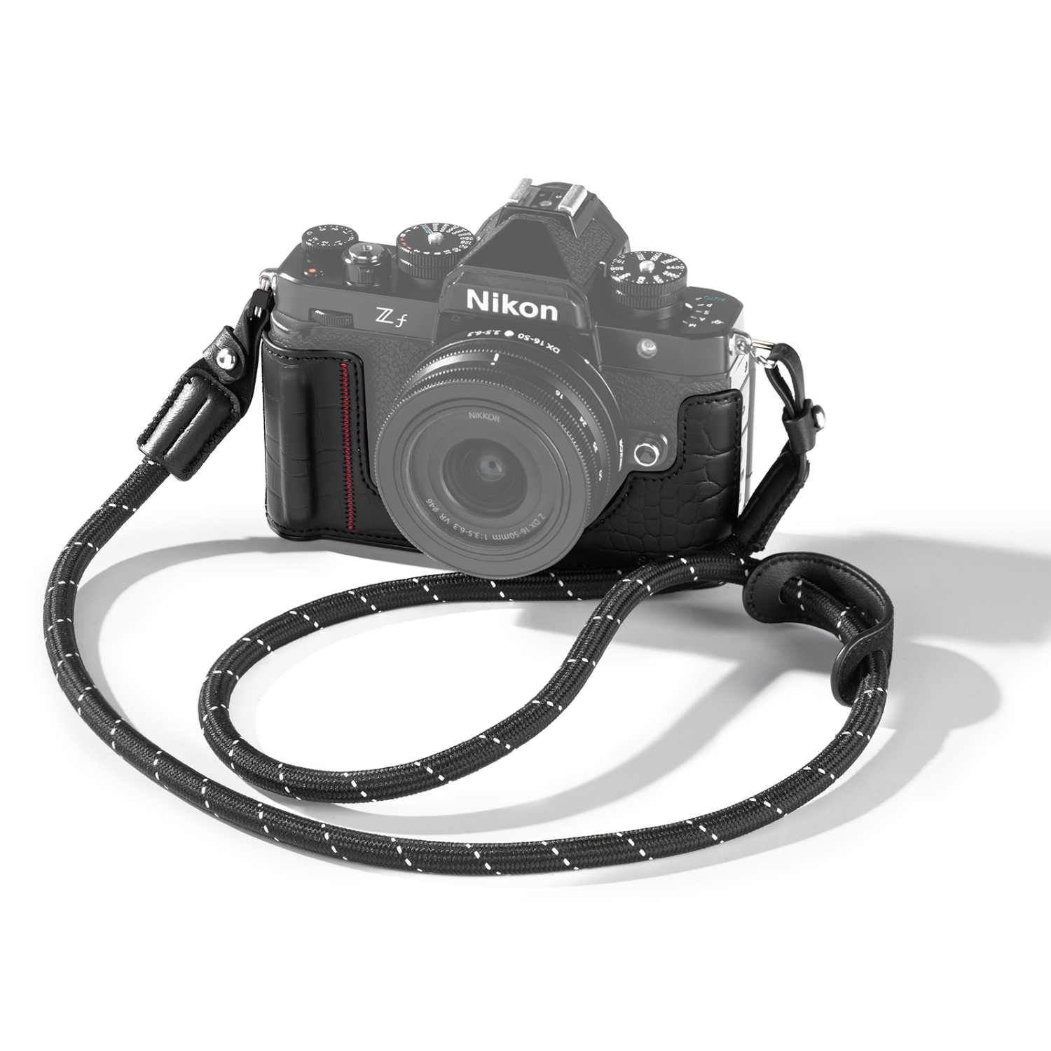 La funda está fabricada en piel sintética PU con una textura que imita la piel de cocodrilo y le da a tu cámara un encanto retro y un tacto de primera calidad. Cuenta con un asa frontal integrada y un reposapulgares para mayor estabilidad y comodidad. La icónica franja roja recupera el diseño clásico de Nikon, mientras que el forro de microfibra proporciona una protección integral contra los arañazos.