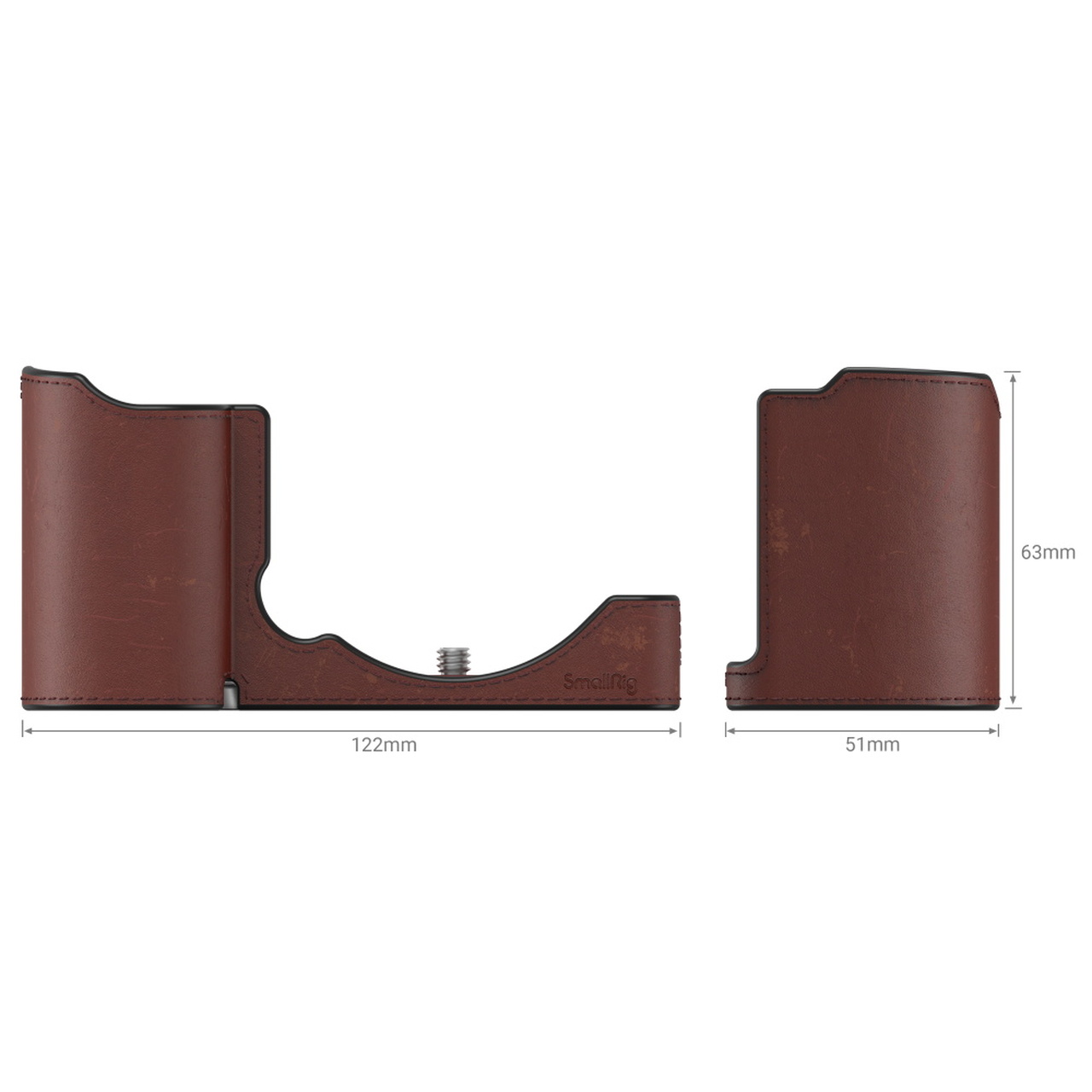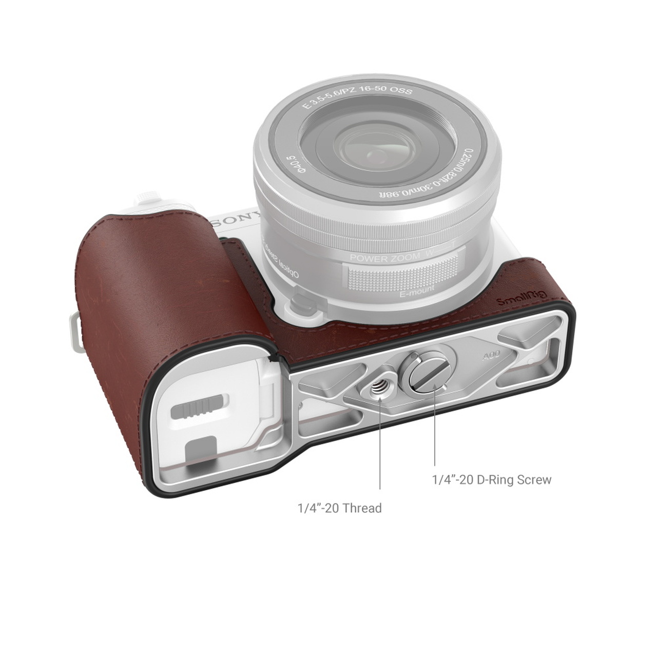 La funda de cuero de media carcasa SmallRig para Sony ZV-E10 3527 está diseñada para ofrecer protección y un mejor agarre. Fabricada a mano con una capa exterior de cuero auténtico y un forro de microfibra que evita que la ropa se manche con el sudor. La funda, con forma adaptada, se fija a la parte inferior de la cámara mediante un tornillo con anilla en D de 1/4''-20 y no bloquea la pantalla abatible ni otras partes inferiores y puertos. Está fabricada en una aleación de aluminio aeronáutico ligero; su placa inferior permite acceder al compartimento de la batería y está equipada con un orificio roscado de 1/4''-20 para fijarla a un trípode sin necesidad de desmontar la mitad de la funda.