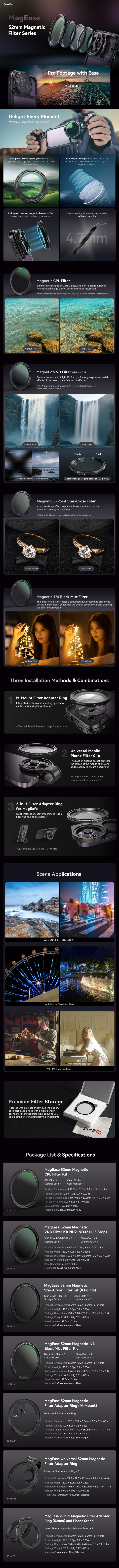 El filtro está fabricado con cristal alemán Schott B270i HD, cuenta con una capa AR resistente al agua, a las manchas, al moho y a los arañazos, con un ligero matiz de color, y también con un marco ultradelgado mecanizado por CNC. No se produce viñeteado ni siquiera al fotografiar con un objetivo ultra gran angular. Se puede fijar de forma magnética y segura al anillo magnético del adaptador de filtro SmallRig.