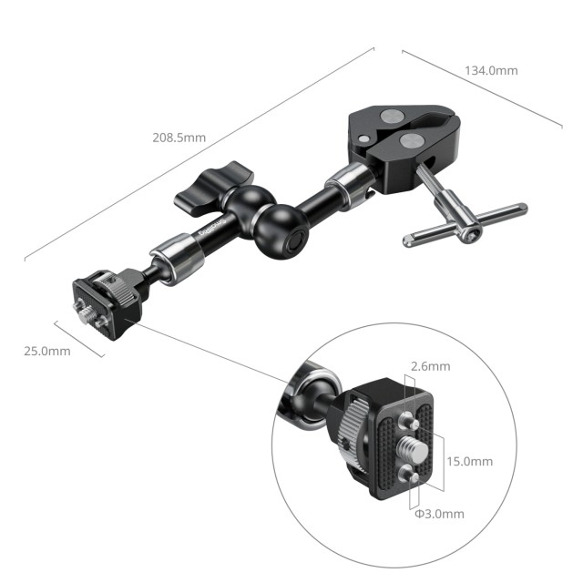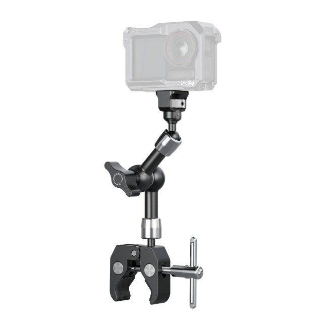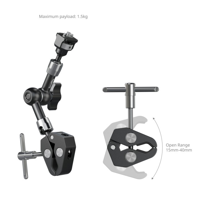 La abrazadera con forma de cangrejo incorpora, en el punto de unión con el brazo mágico, un diseño antitorsión que evita que se afloje o se suelte. Es adecuada para tubos, mesas, patas de trípode o anillos estabilizadores de mano con un diámetro de entre 15 y 40 mm (0,6 a 1,6 pulgadas) y cuenta con arandelas integradas para una mayor estabilidad y protección.