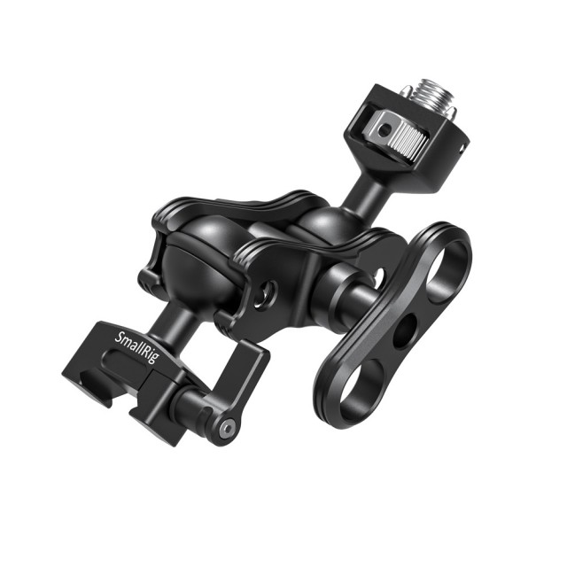 En un extremo se puede fijar la parte lateral o superior de la jaula de la cámara, y en el otro extremo se puede fijar la parte lateral o superior de la jaula del monitor. Las dos rótulas se suministran con almohadillas de goma que aumentan la fricción entre la rótula y la abrazadera de la rótula, garantizando así una fijación firme.