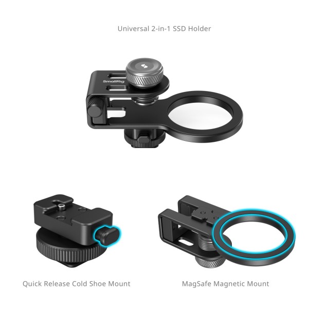 El soporte universal 2 en 1 SmallRig MagSafe / Cold Shoe para SSD 4779 está diseñado para conectar discos duros externos USB-C al fotografiar con un smartphone. Es compatible con discos SSD de 8,0 a 16,0 mm de grosor, especialmente con los modelos Samsung T7, Samsung T7 Shield y Samsung T9. La abrazadera está equipada con un soporte cold shoe deslizante que se puede instalar rápidamente en la base de la abrazadera, lo que permite la conexión a diversos dispositivos. Para la fijación magnética MagSafe en los lugares deseados, como portátiles o iPhones con MagSafe, se puede retirar el soporte cold shoe. Ambos métodos de instalación son sencillos y rápidos, lo que facilita transiciones fluidas entre los distintos escenarios de uso. Además, la abrazadera cuenta con un acolchado de silicona que evita que se raye el disco SSD. La abrazadera para cables de la base sujeta el cable USB-C mediante un tornillo de mariposa para una transferencia de datos cómoda y estable. Además, incluye una etiqueta metálica en forma de anillo para un uso versátil en diversos entornos.