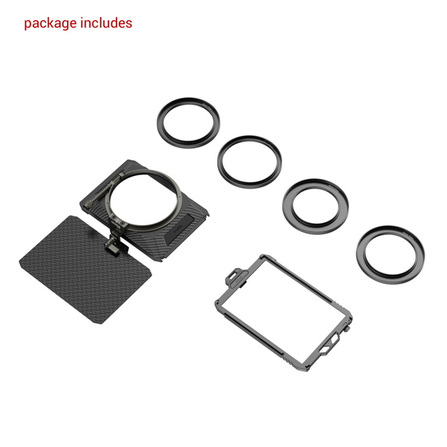 Portafiltros fácil de guardar (ID: 3319/3320), que se puede fijar rápidamente al mattebox mediante una abrazadera NATO, tiene capacidad para varios filtros deslizantes de 4 x 5,65"/4 x 4" y 4 mm de grosor, protege los filtros contra caídas accidentales y evita arañazos y huellas dactilares al cambiarlos. La tapa superior ajustable de fibra de carbono bloquea la luz solar o la luz intensa y, gracias a su diseño antirreflectante, evita los reflejos internos.